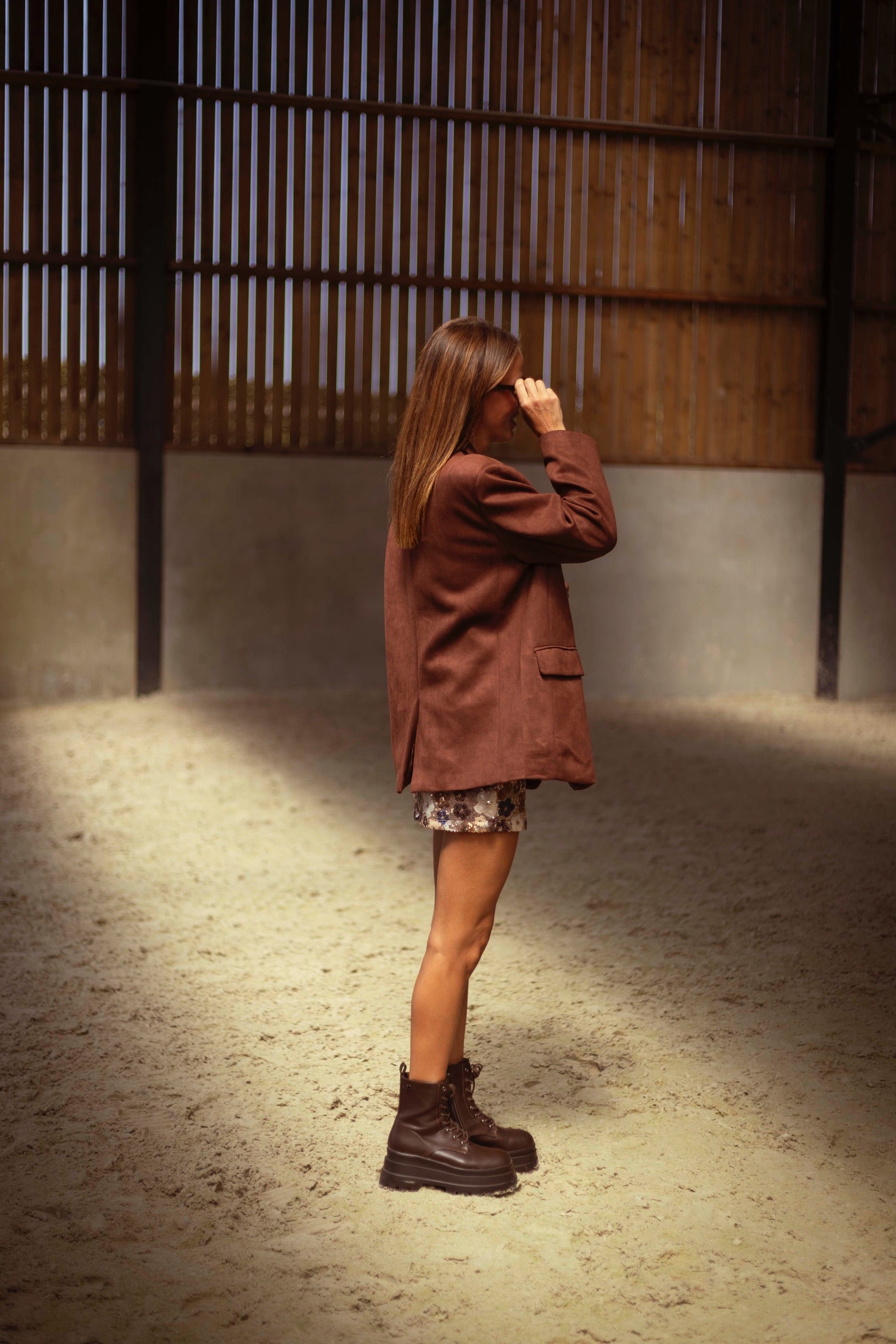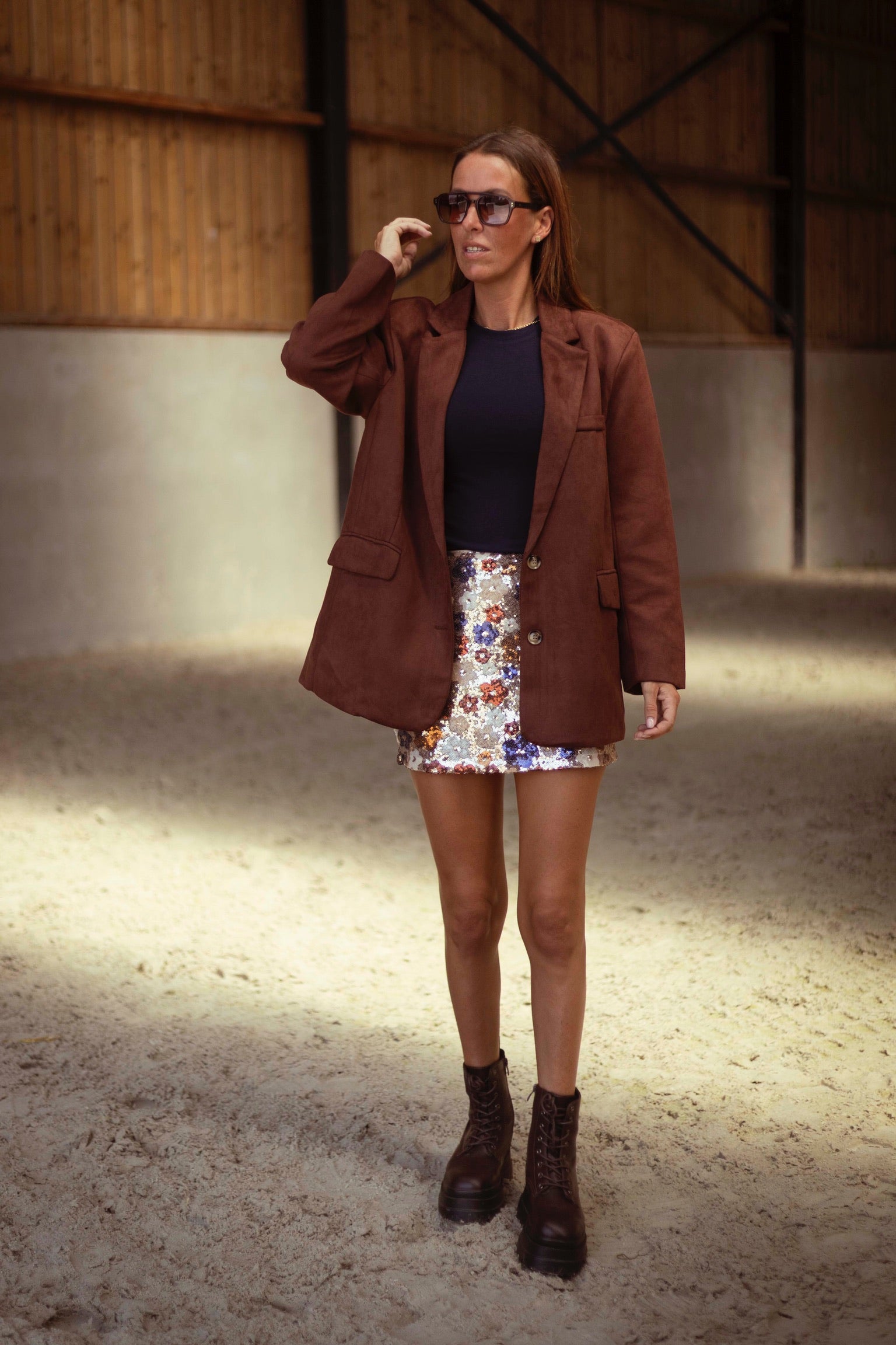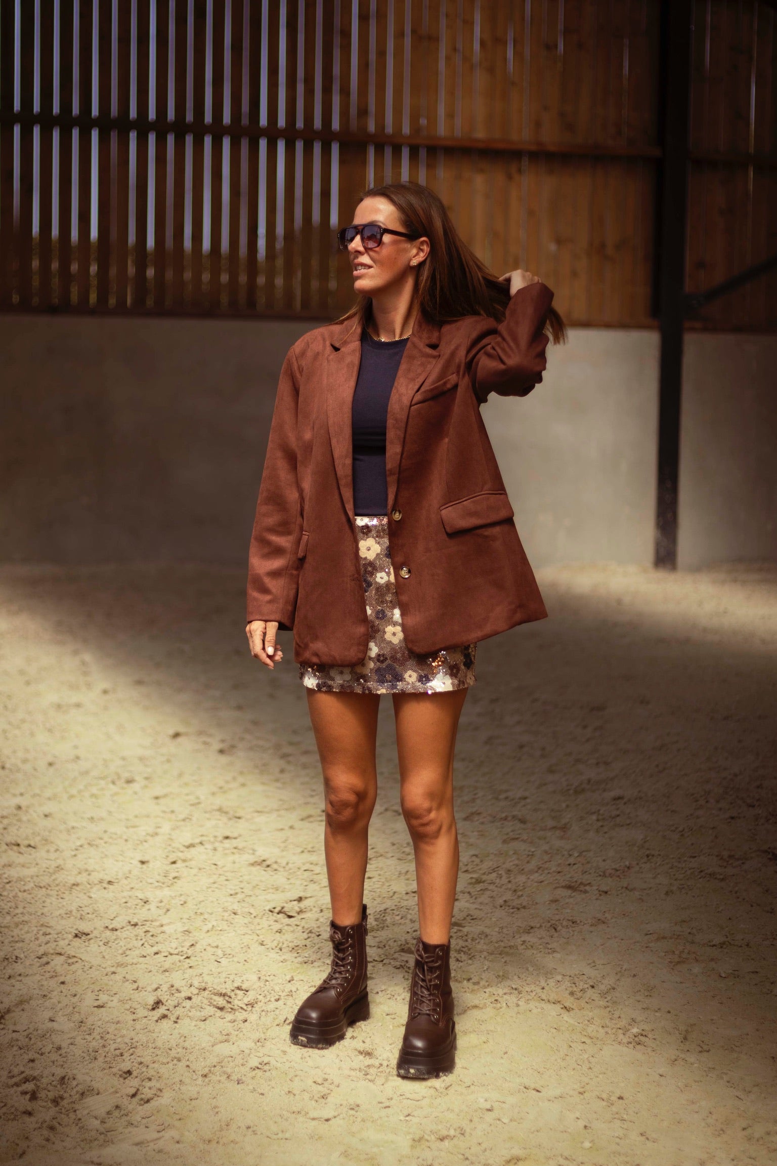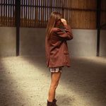 Een tijdloze blazer in zachtbruin suède die moeiteloos warmte en stijl samenbrengt. De gestructureerde snit geeft elke outfit een geraffineerde touch, terwijl het materiaal perfect aansluit bij het rijke kleurenpalet van de herfst. Draag hem open over een jurk of gesloten met een hoge broek voor een krachtige, seizoensklare look.