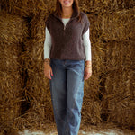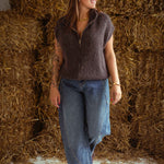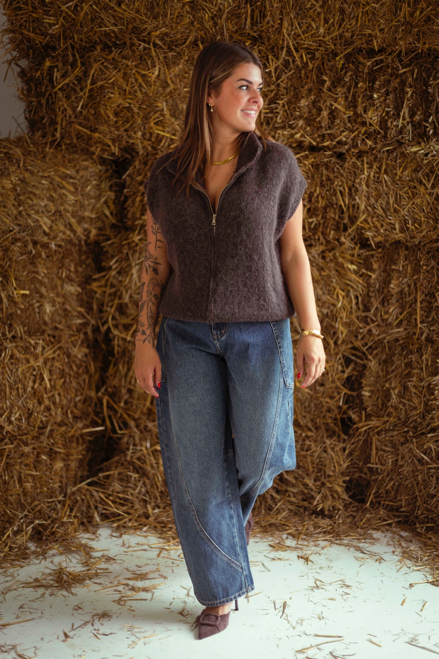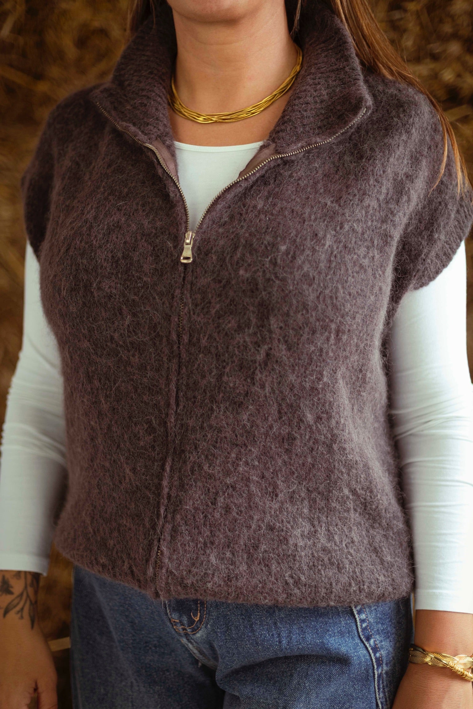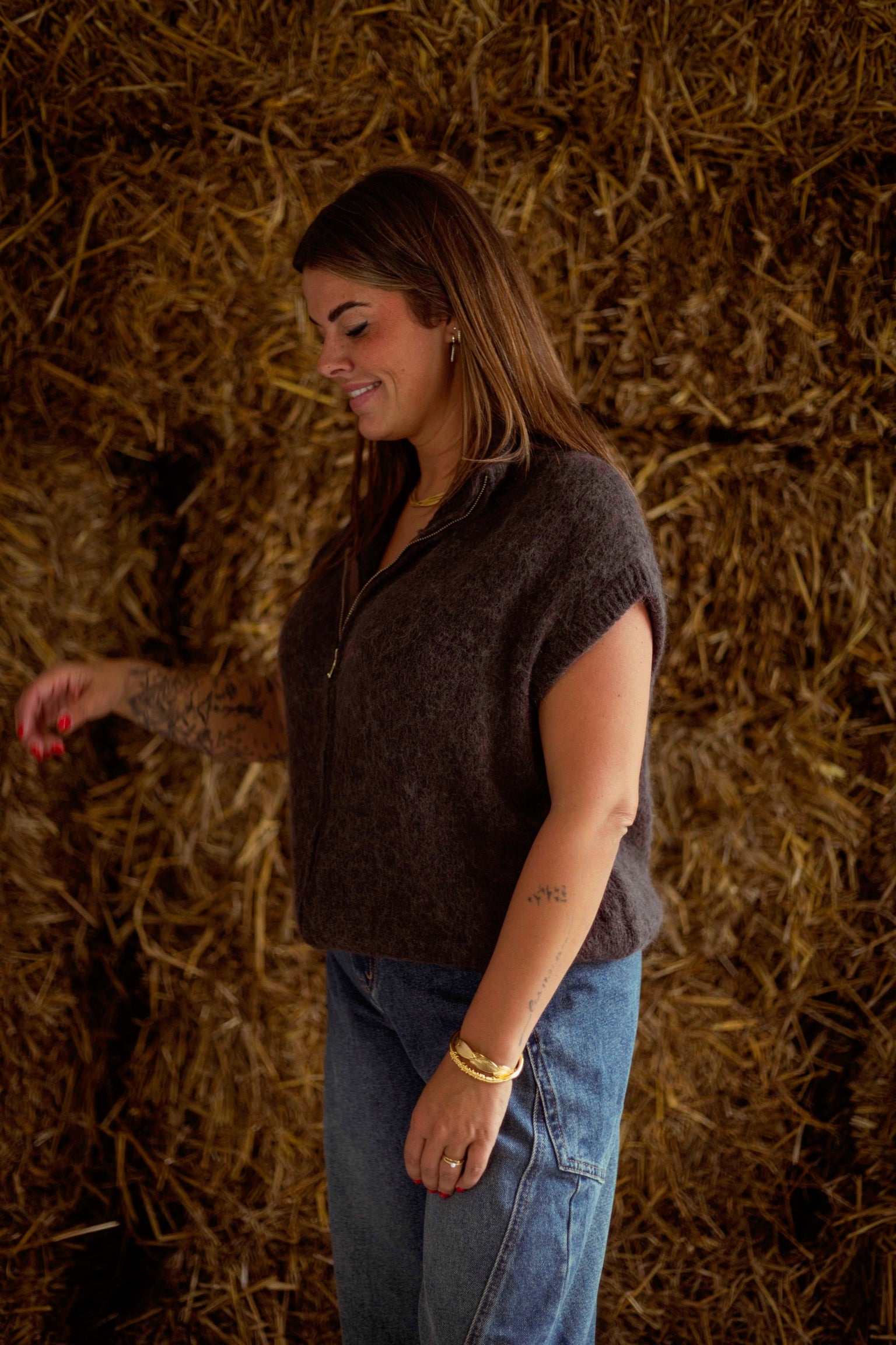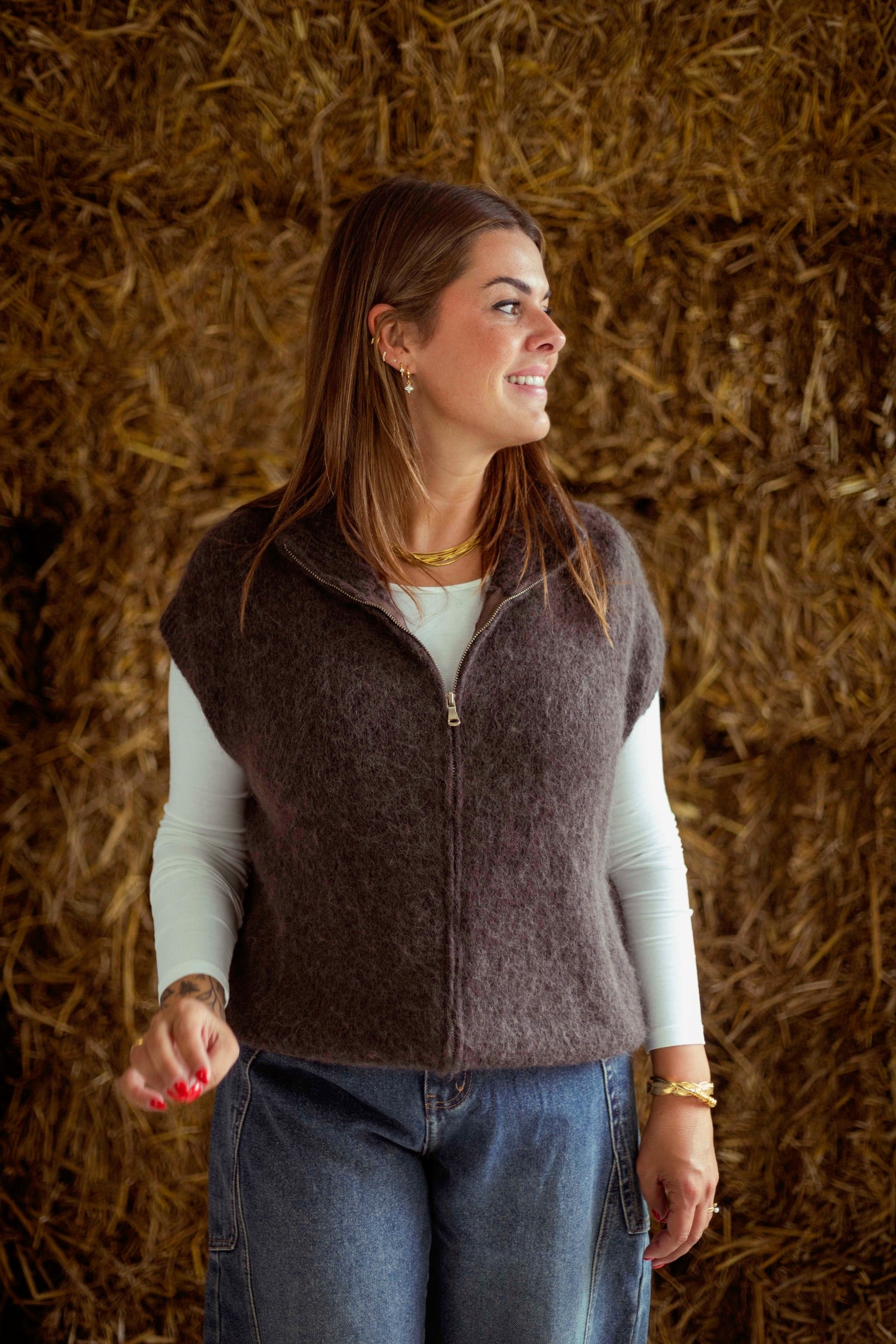 Een grove knit met rits in een warme bruintint, ideaal voor wisselvallig herfstweer. De rechte snit en hoge kraag zorgen voor een praktische maar stijlvolle laag over elke outfit. Werkt goed met jeans of een losvallende pantalon.