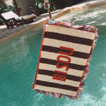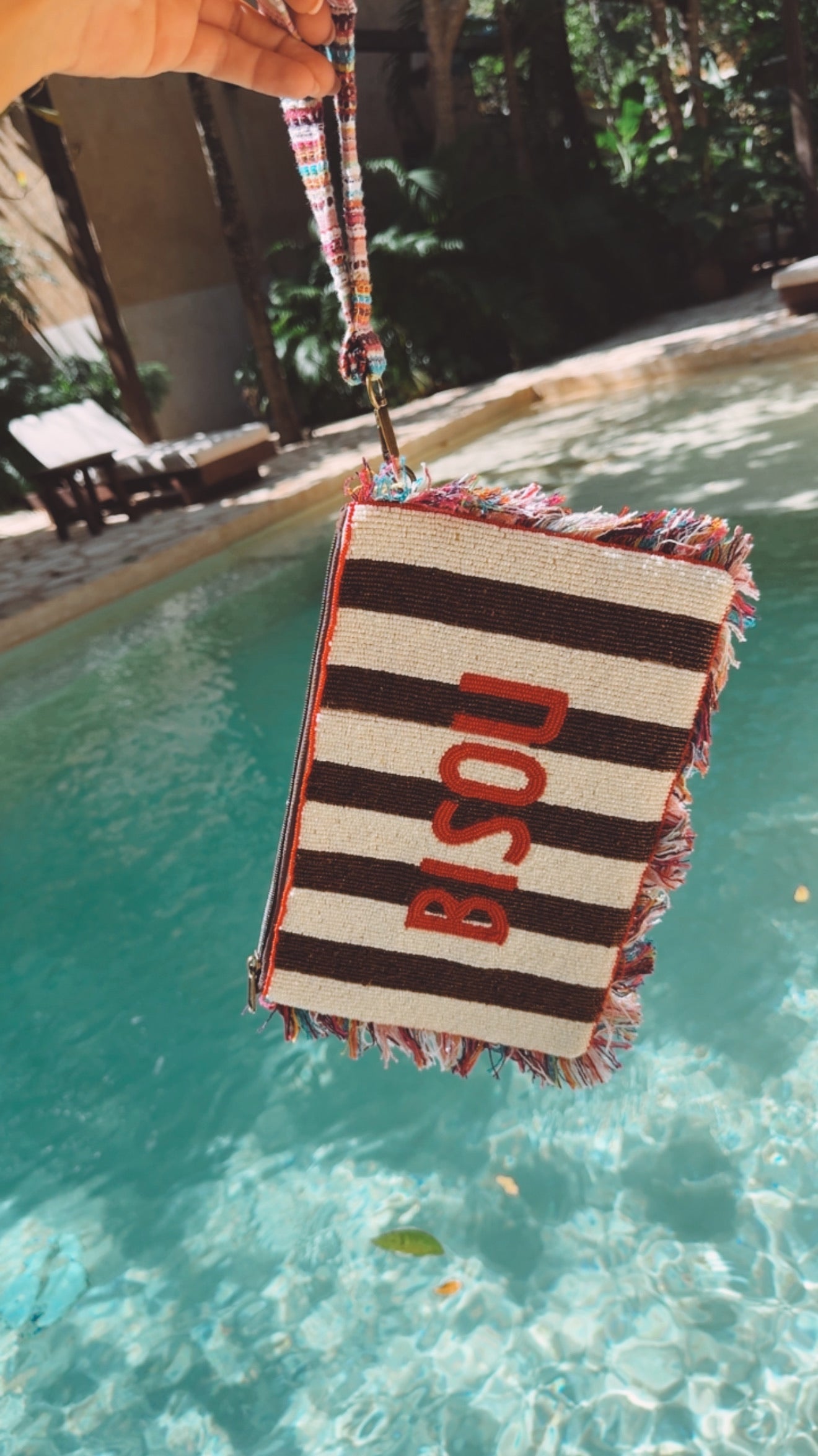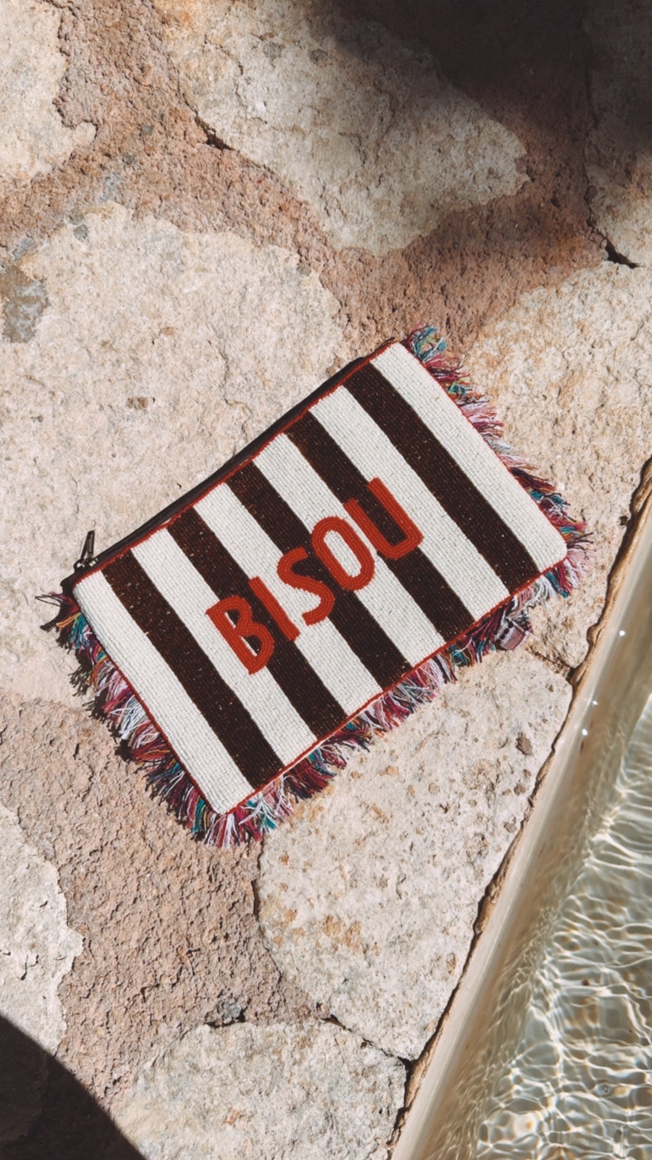 Een speelse clutch met een gestreept ontwerp en subtiele pareltjes die een zomerse en vrolijke touch geven. Het kleurrijke achterpaneel voegt een verrassend detail toe, terwijl het woord “Bisou” een charmante finishing touch biedt. Perfect om een zomerse outfit een elegante én levendige flair te geven.