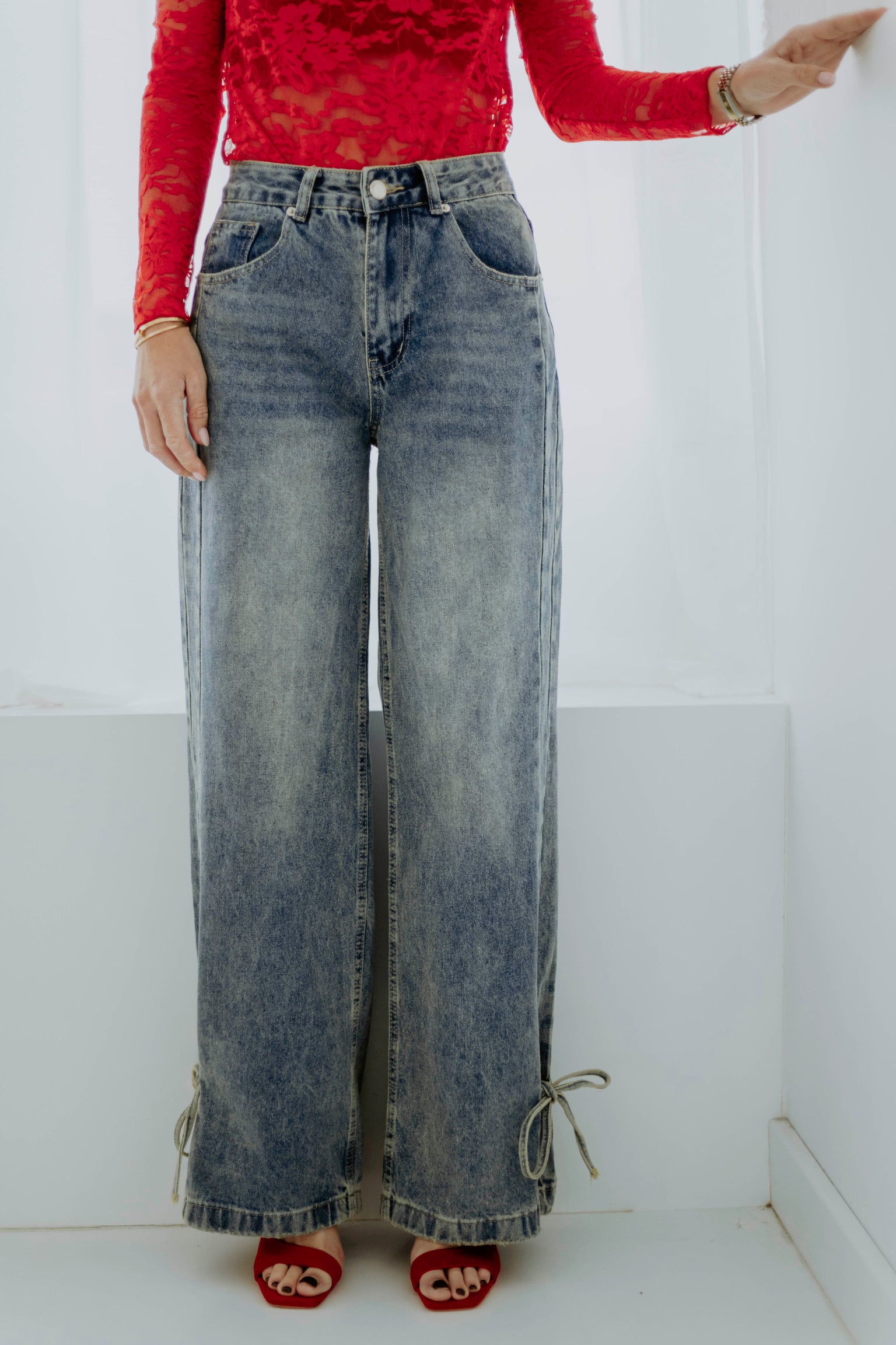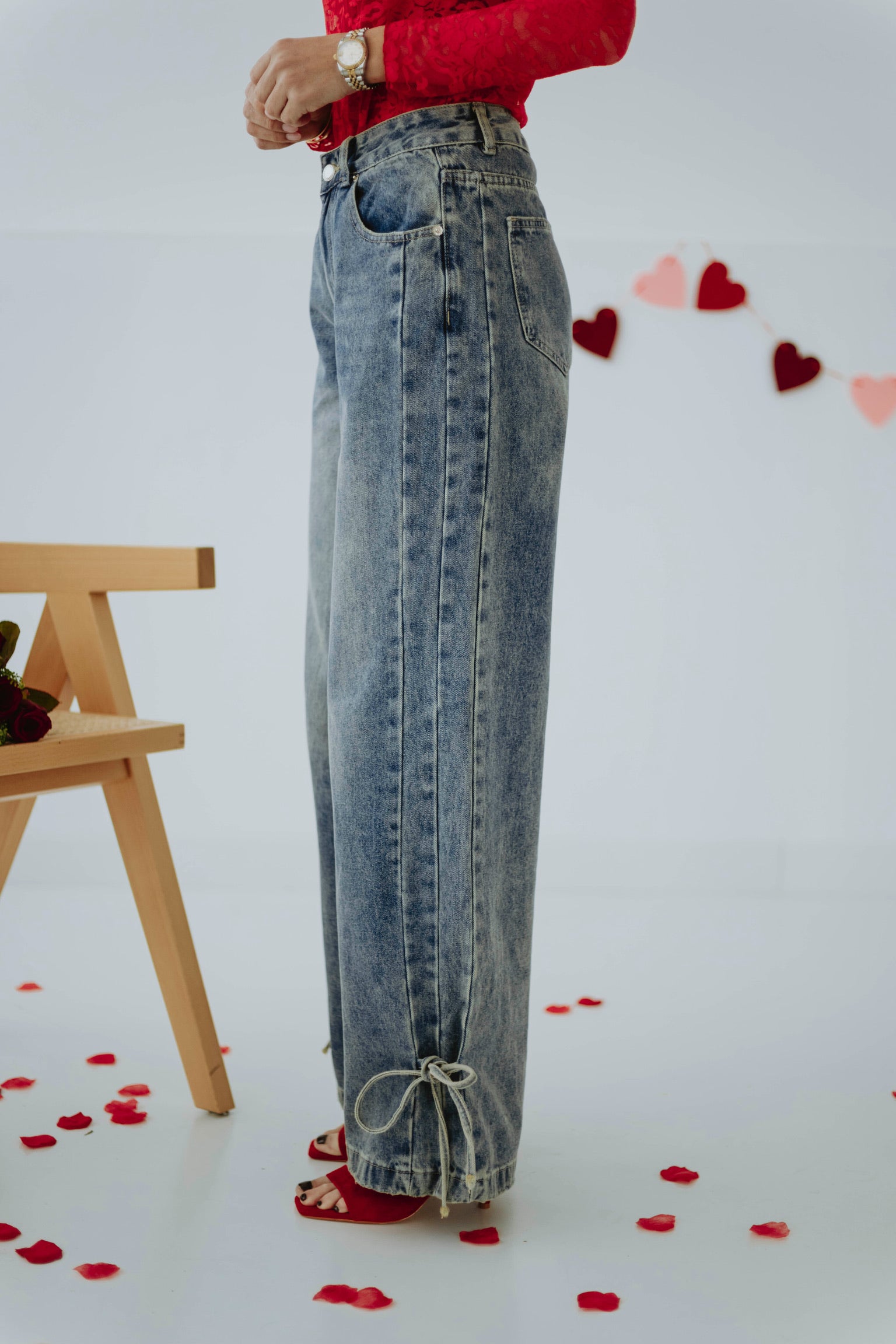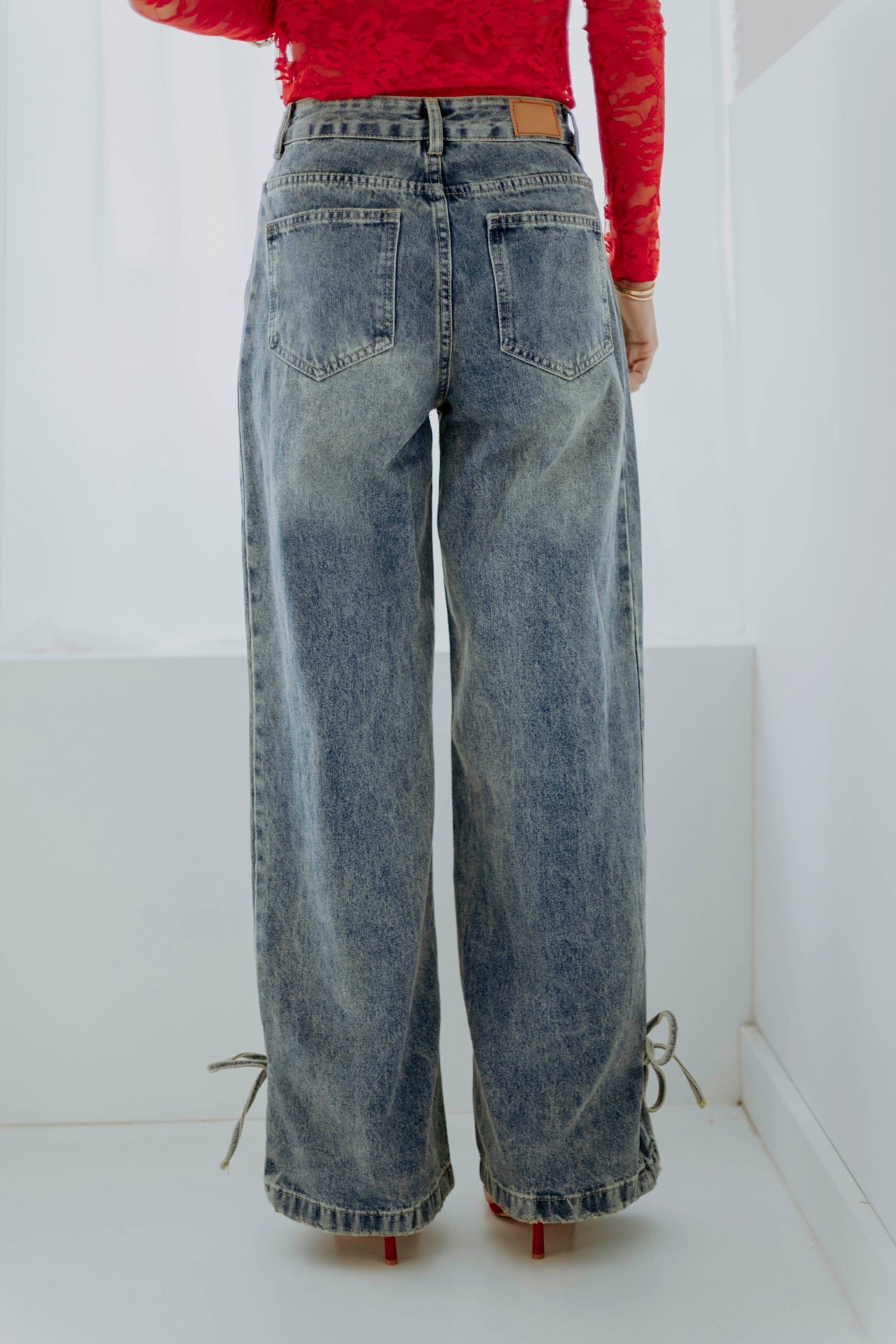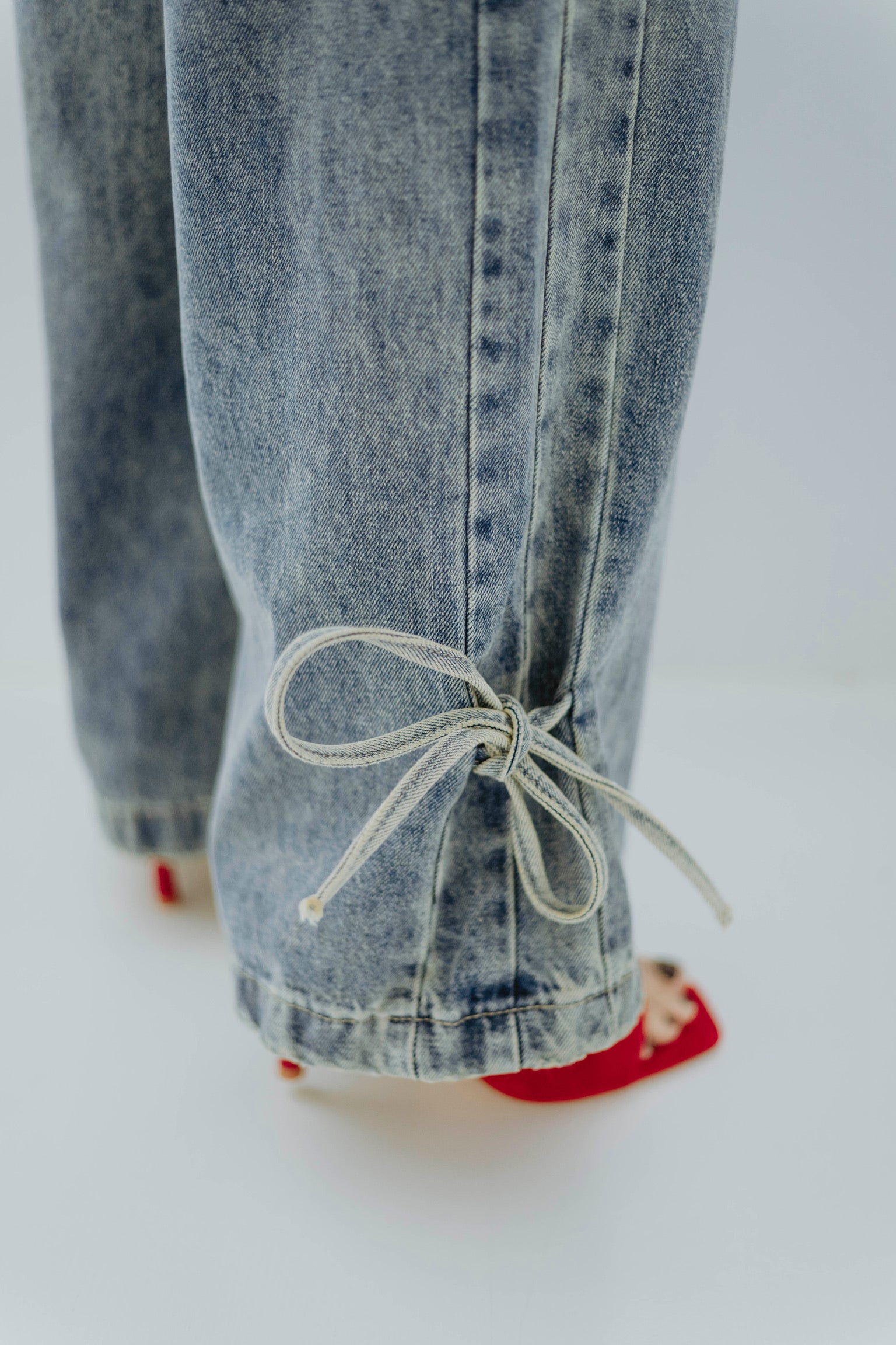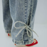 De blauwe wassing en wijde pijpen zorgen voor een frisse en moderne uitstraling. Het strikdetail onderaan bij de enkels geeft een speelse en unieke twist. Perfect om een casual look net dat beetje extra karakter te geven.