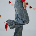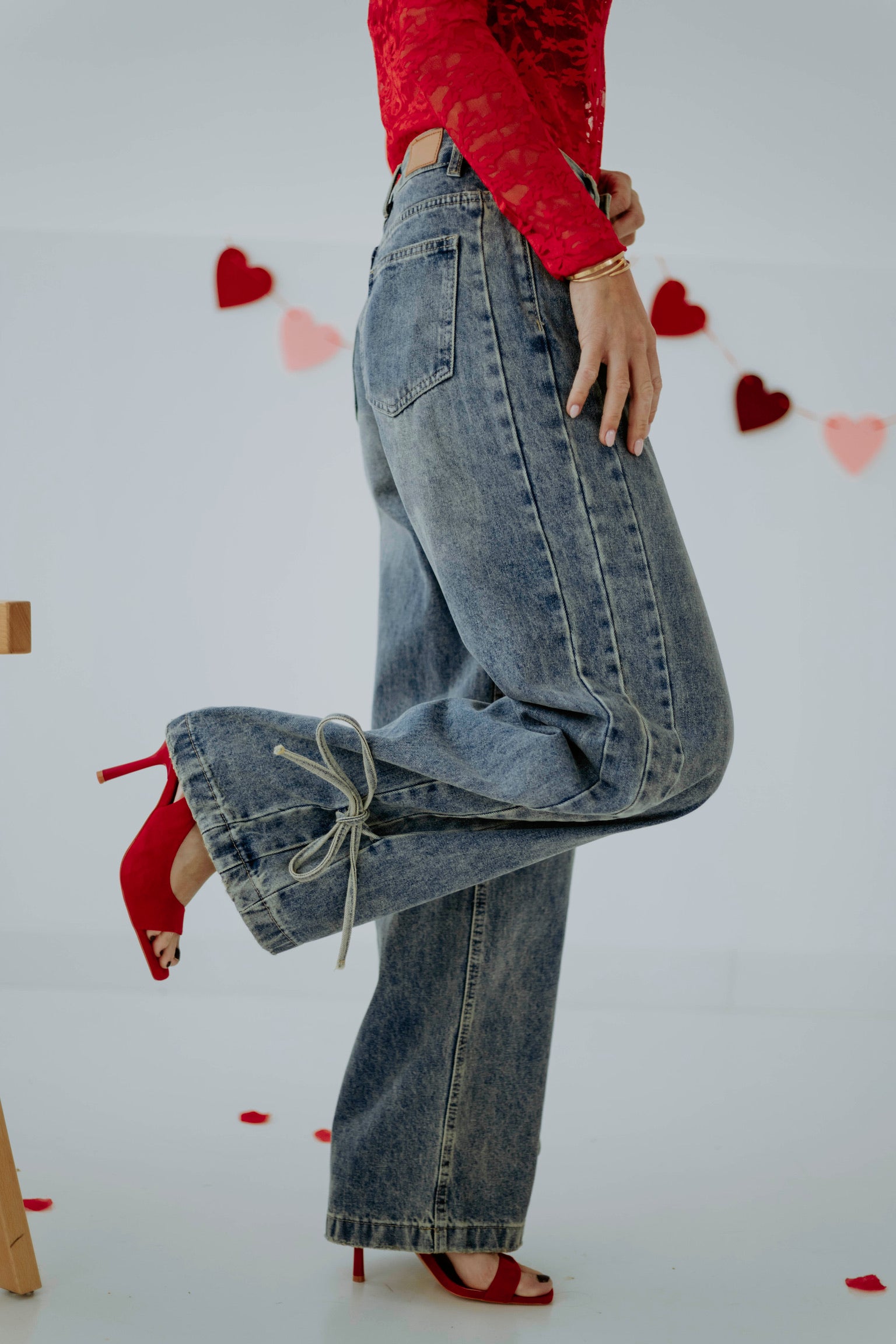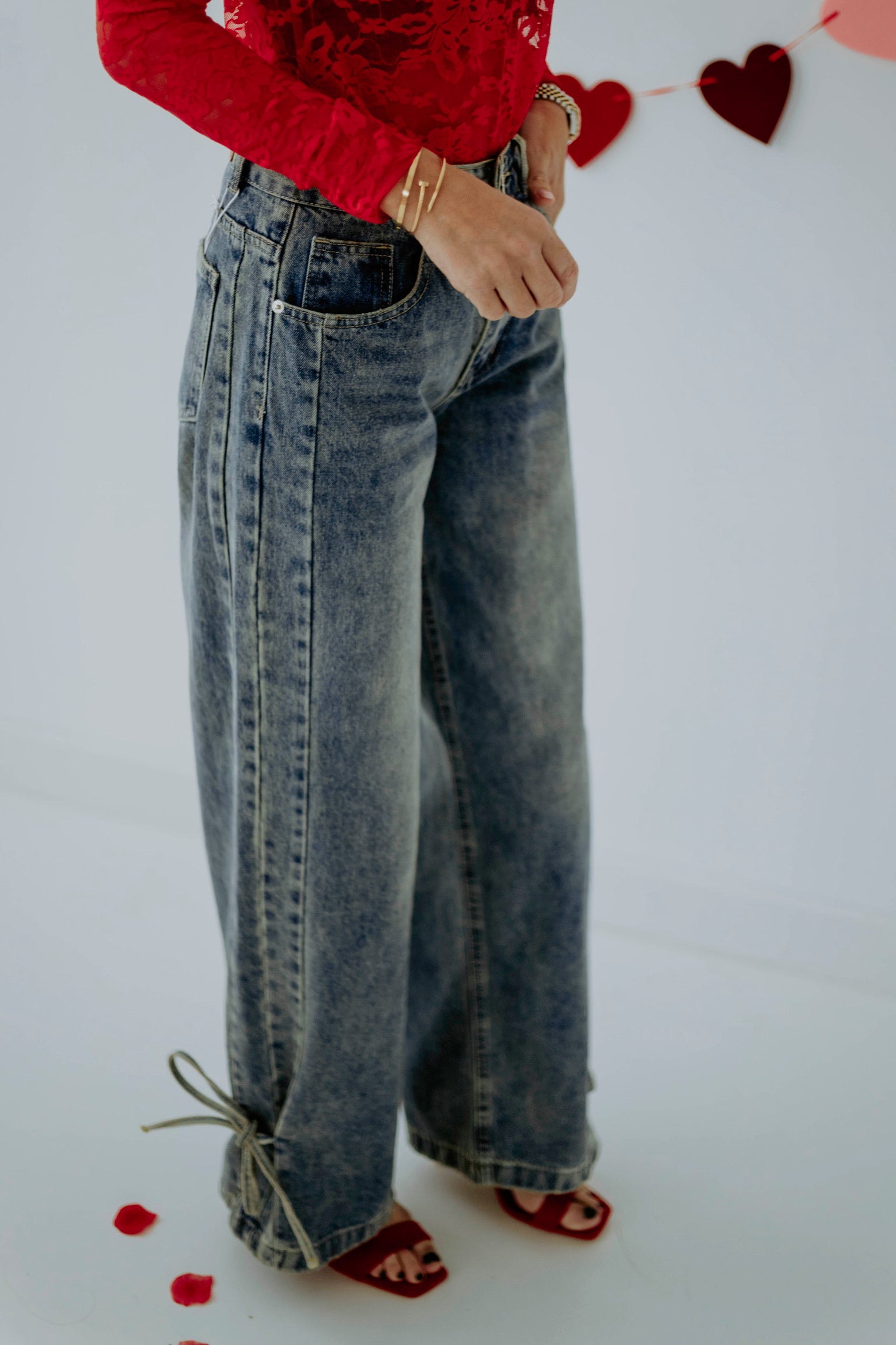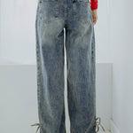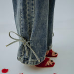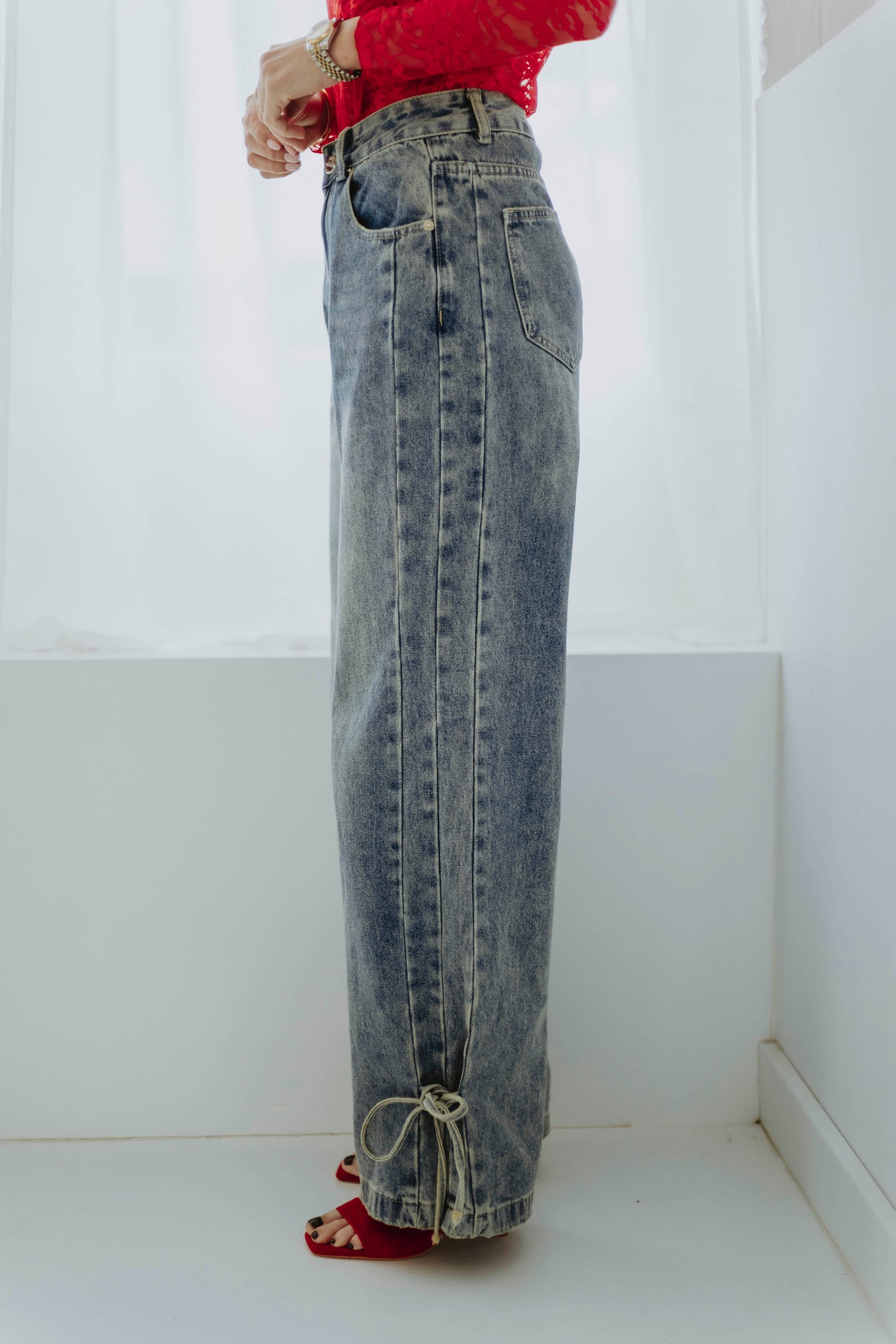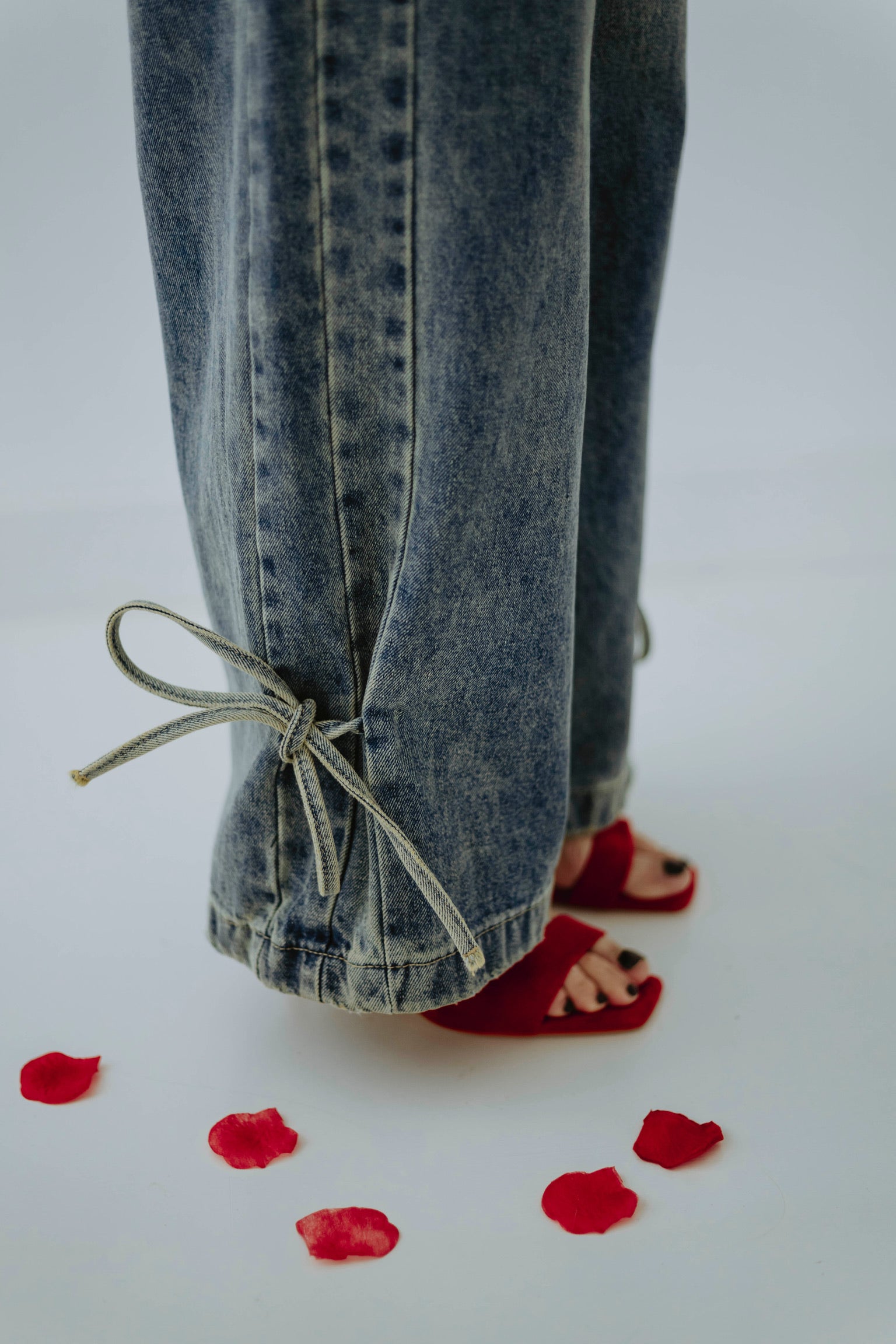 De blauwe wassing en wijde pijpen zorgen voor een frisse en moderne uitstraling. Het strikdetail onderaan bij de enkels geeft een speelse en unieke twist. Perfect om een casual look net dat beetje extra karakter te geven.