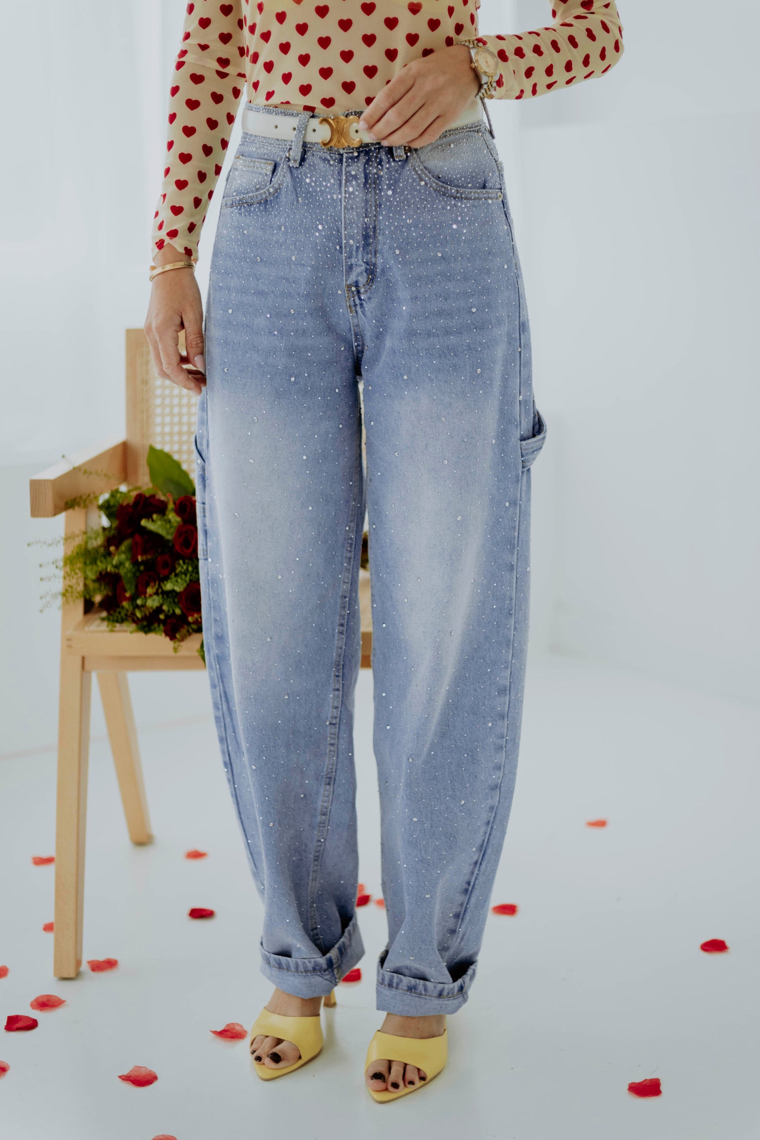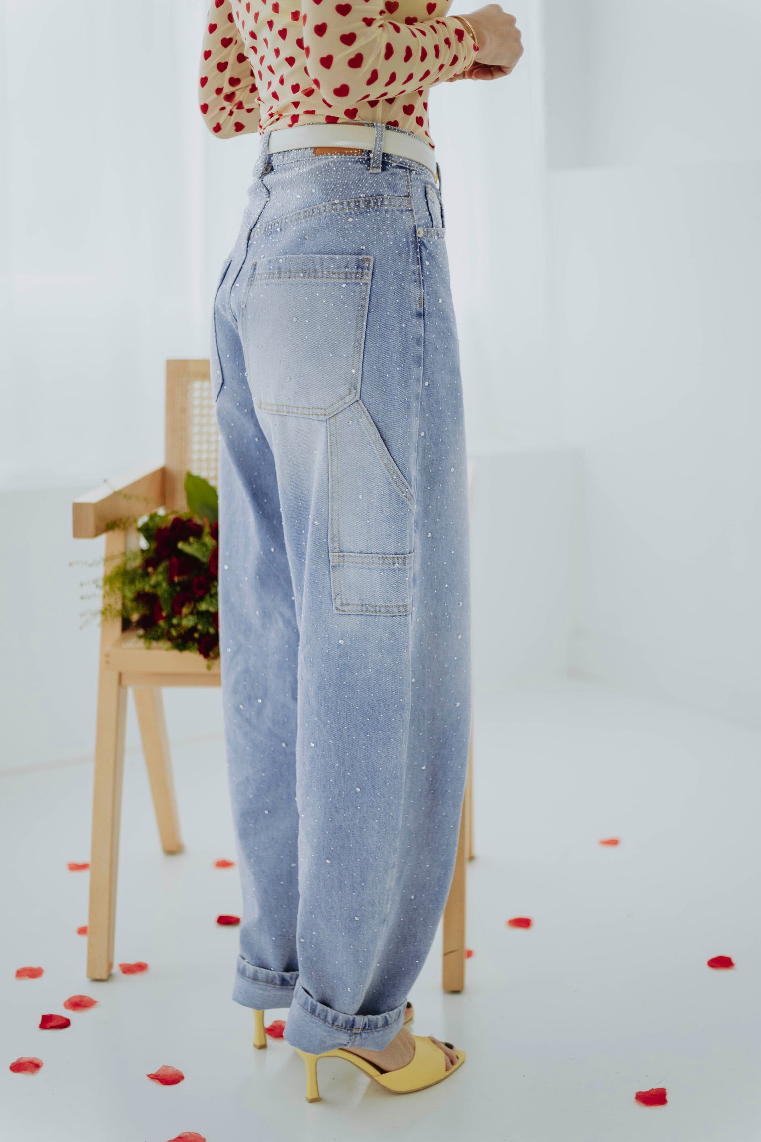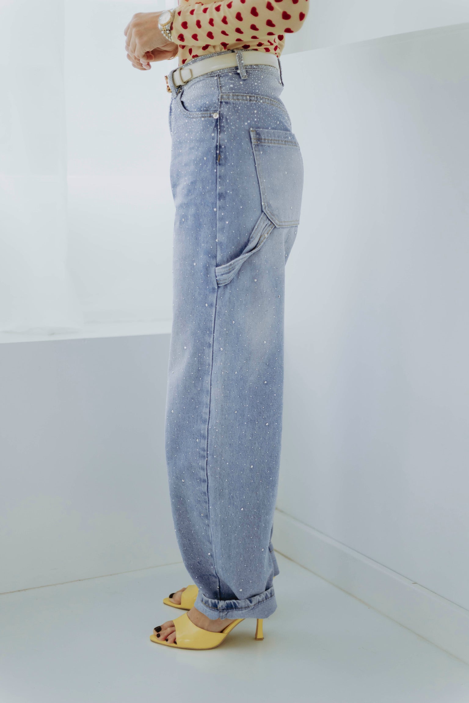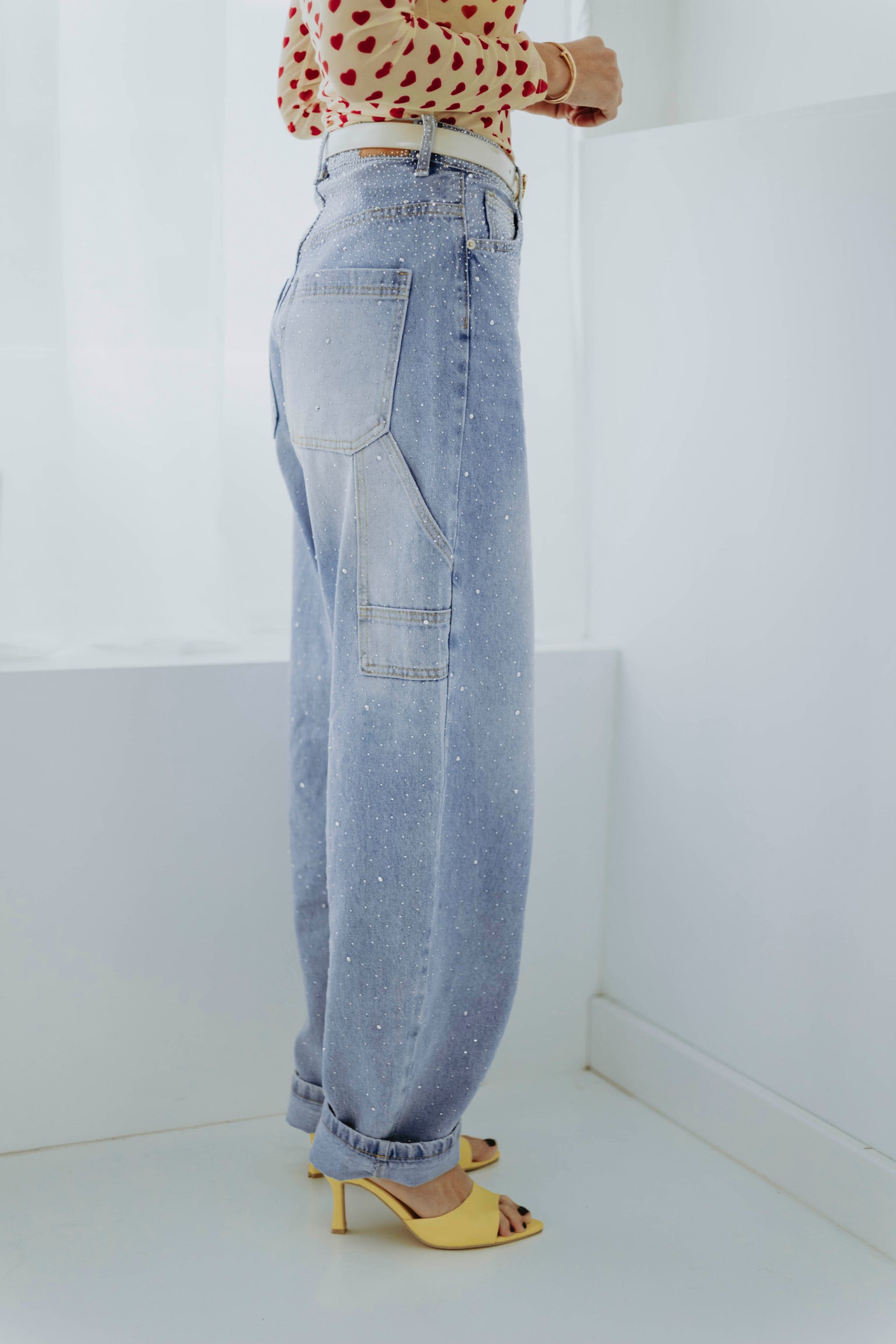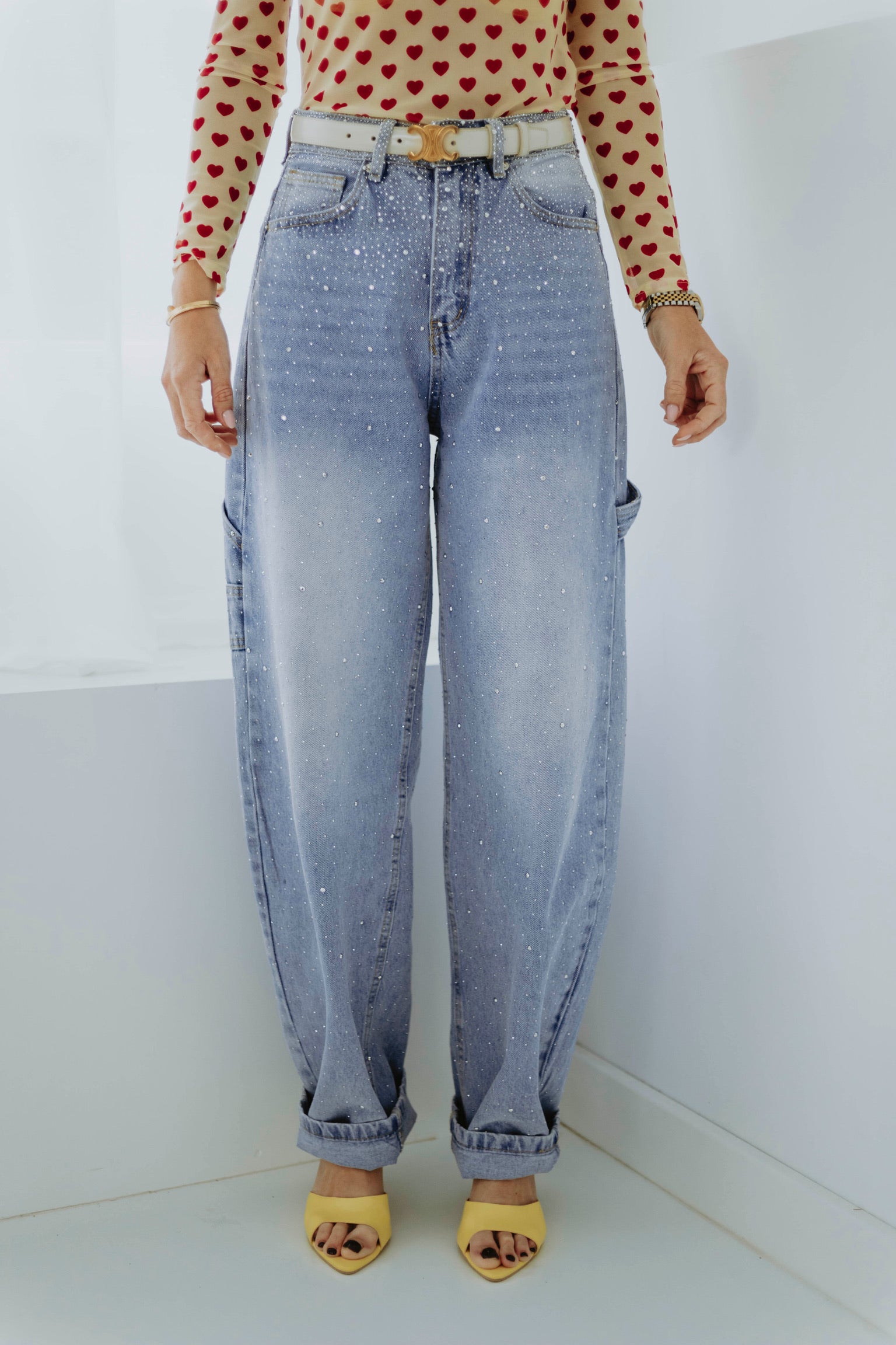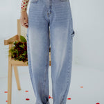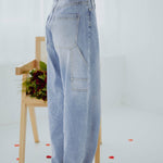 De lichtblauwe wassing en speelse ballonvorm geven een frisse en moderne lentestijl. Kleine rhinestone-details zorgen voor een subtiel glinsterend accent dat de look bijzonder maakt. Perfect om een casual outfit een stoere maar stijlvolle touch te geven.