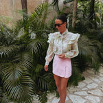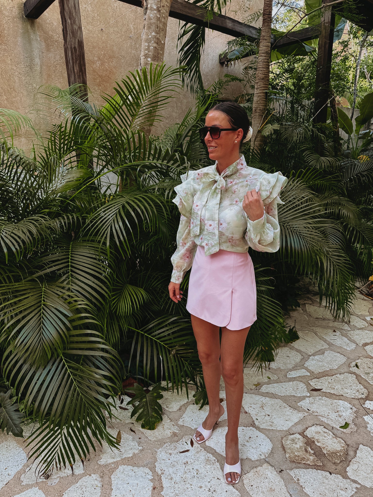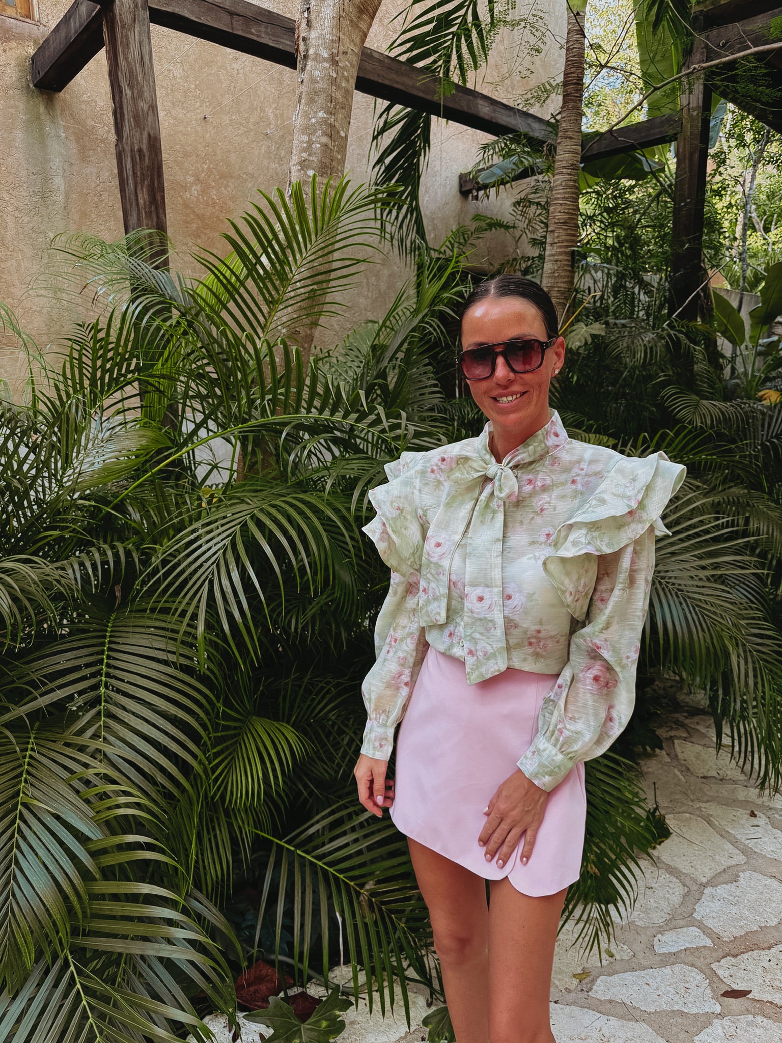 Een frisse mintgroene blouse met een speelse bloemenprint die meteen zomerse energie uitstraalt. Het strikdetail biedt de mogelijkheid om het halflangs te knopen, waardoor een casual en charmante look ontstaat. Ideaal voor zonnige dagen, vakantie-uitjes of een relaxte lunch in de zon.