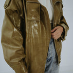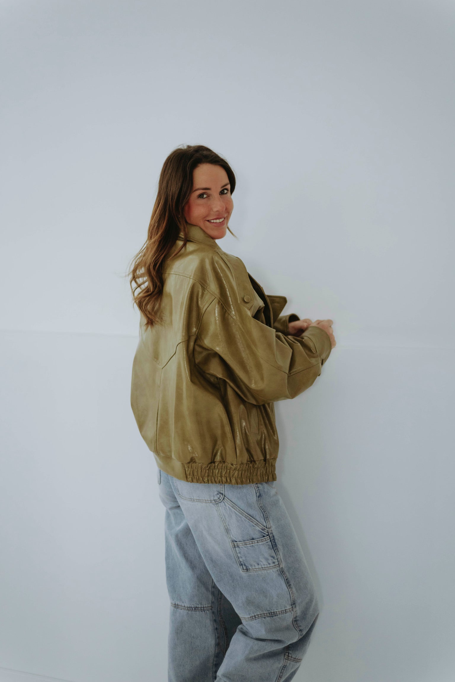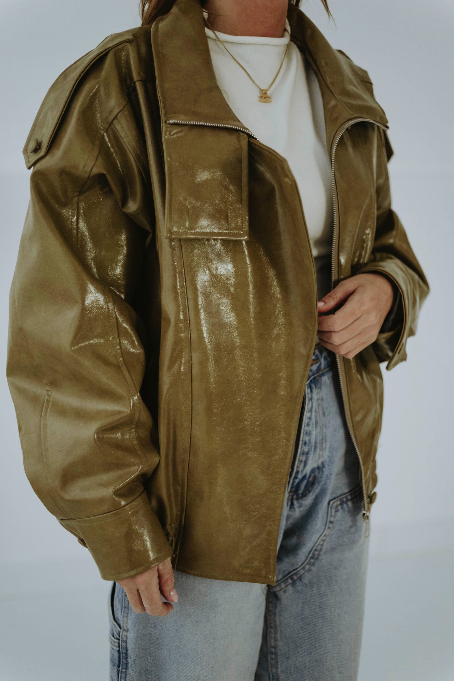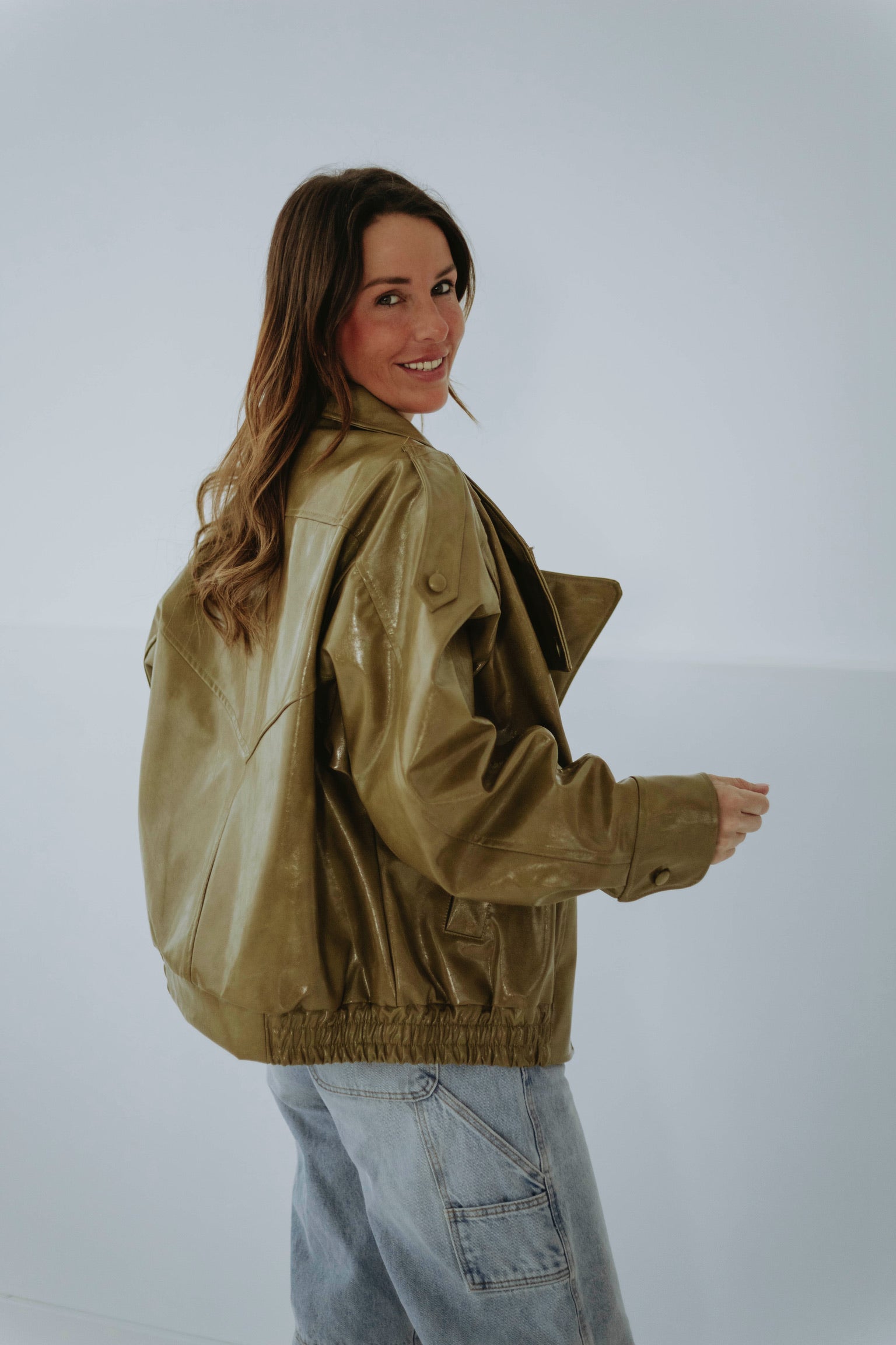 EVELYNE OLIVE GREEN SHINY LEATHER JACKET