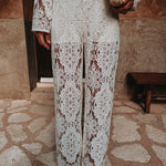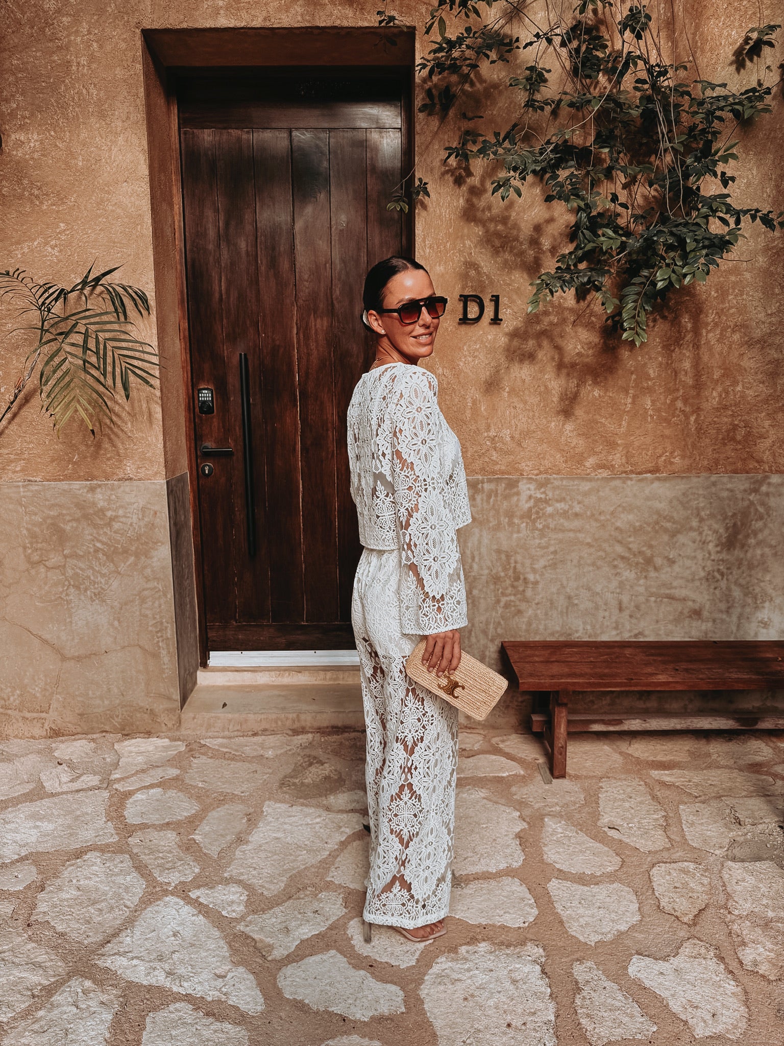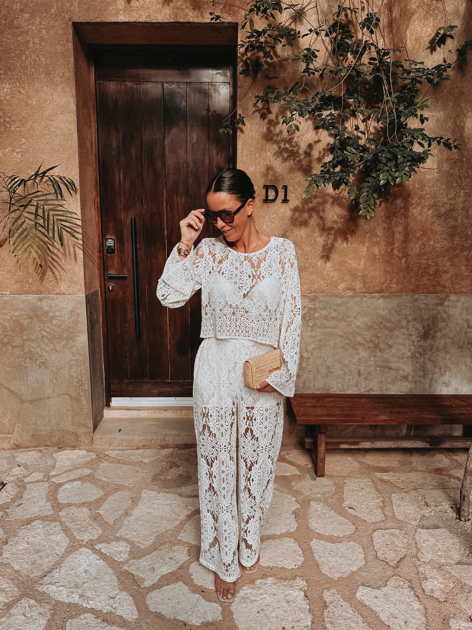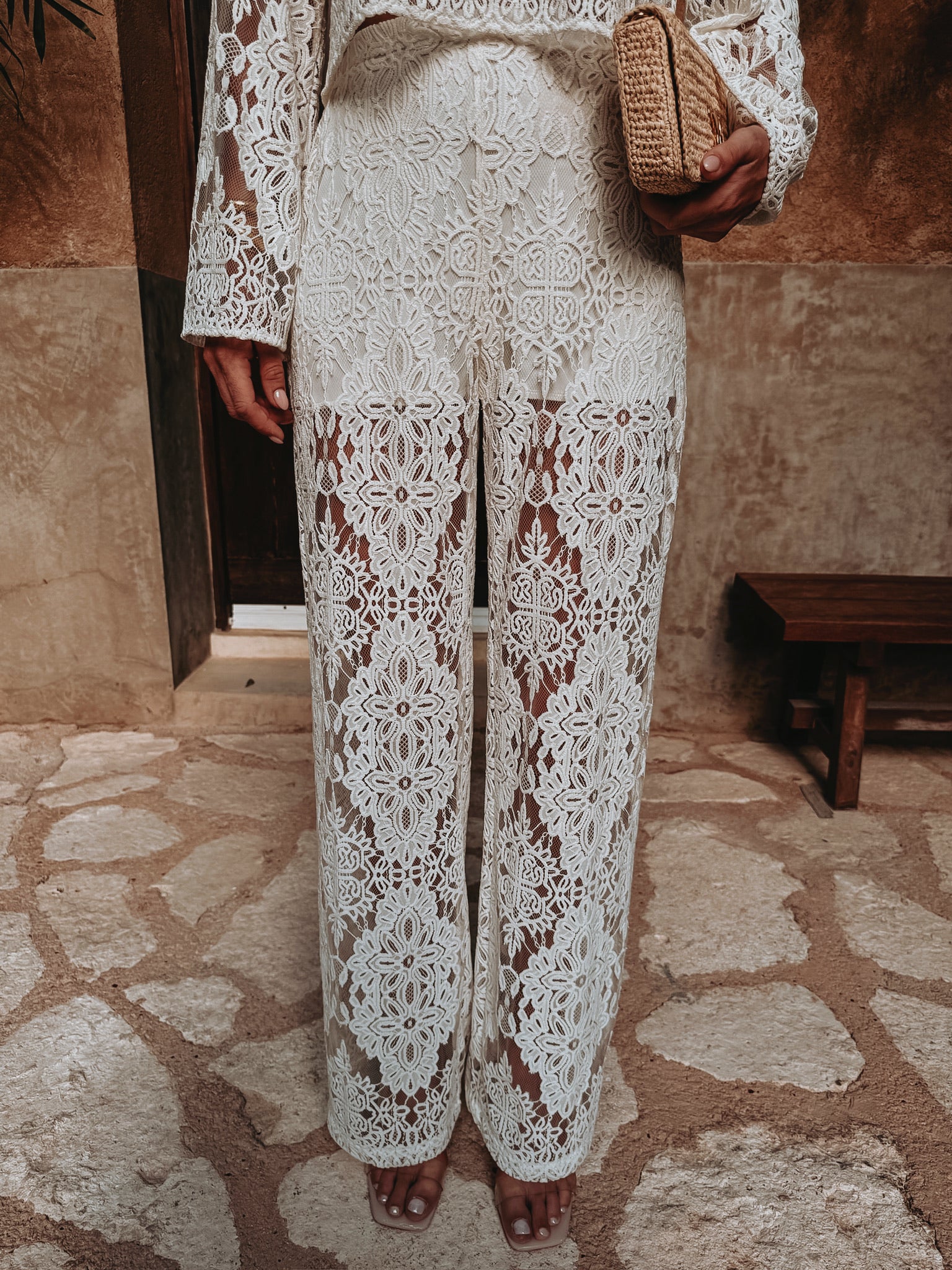Luchtige broek met een speelse twist: een kort onderstuk met daarover een verfijnde gehaakte laag die subtiel doorschijnt. Perfect voor zonnige dagen en zwoele avonden aan zee. Combineer met de bijpassende blouse voor een effortless set of draag hem los voor een relaxte vakantie look.