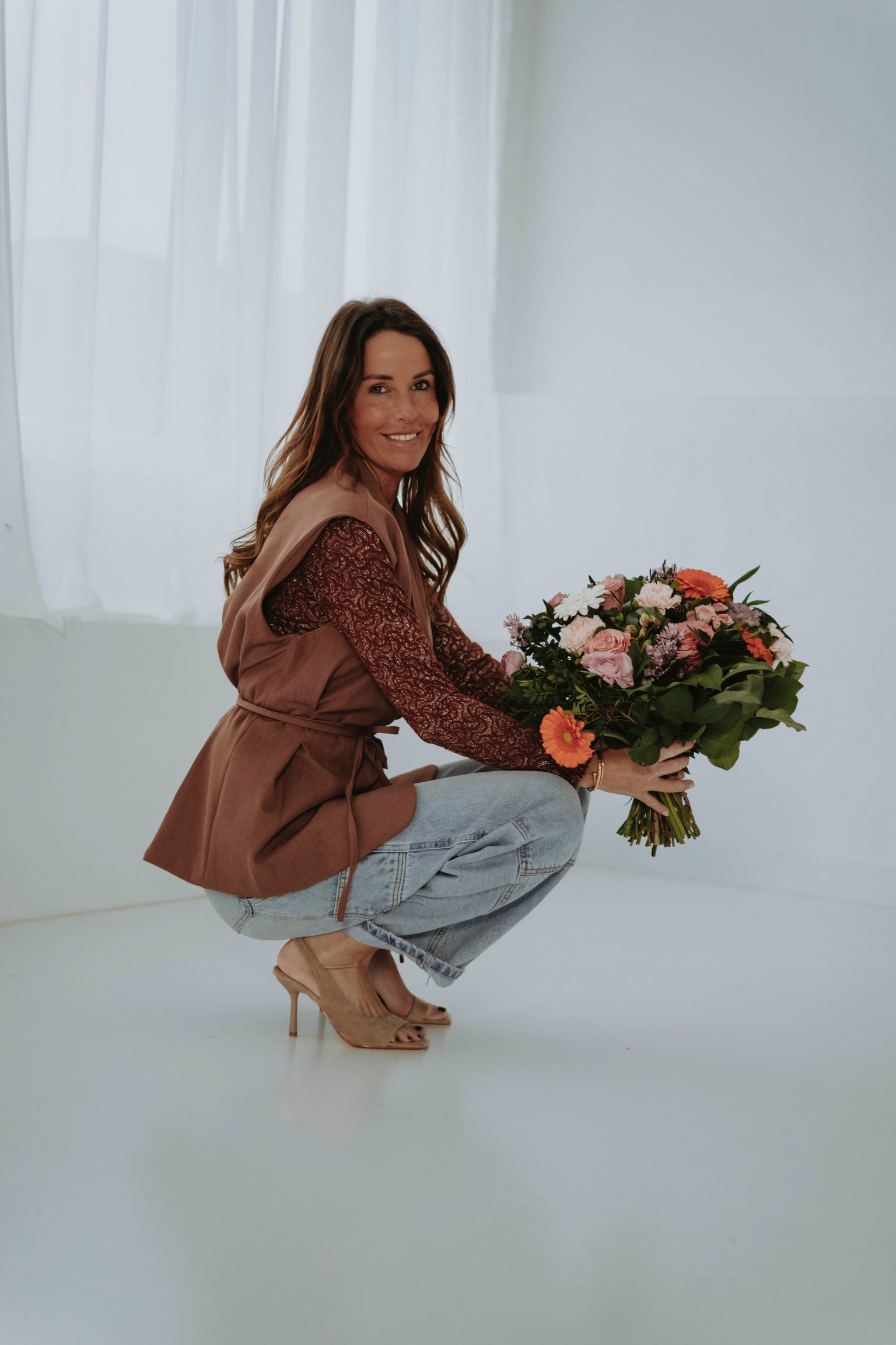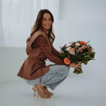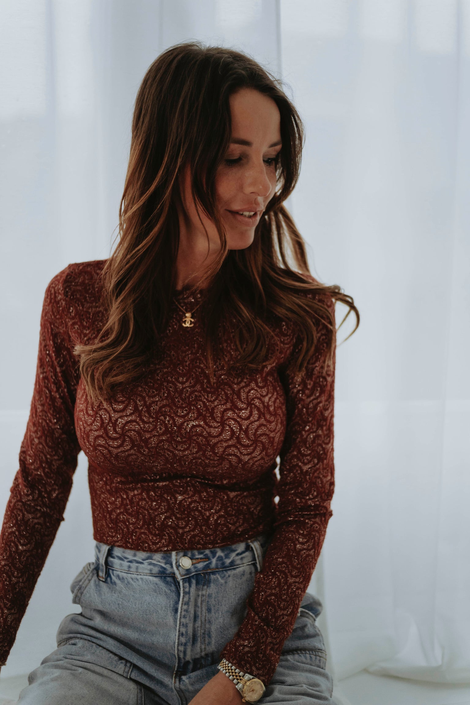 Glanzend en elegant, met een subtiele sparkle die het terracottakleurige geheel tot leven brengt. De lange mouwen zorgen voor een zachte, omhullende pasvorm, perfect voor een sprankelende lentestijl van dag tot avond.