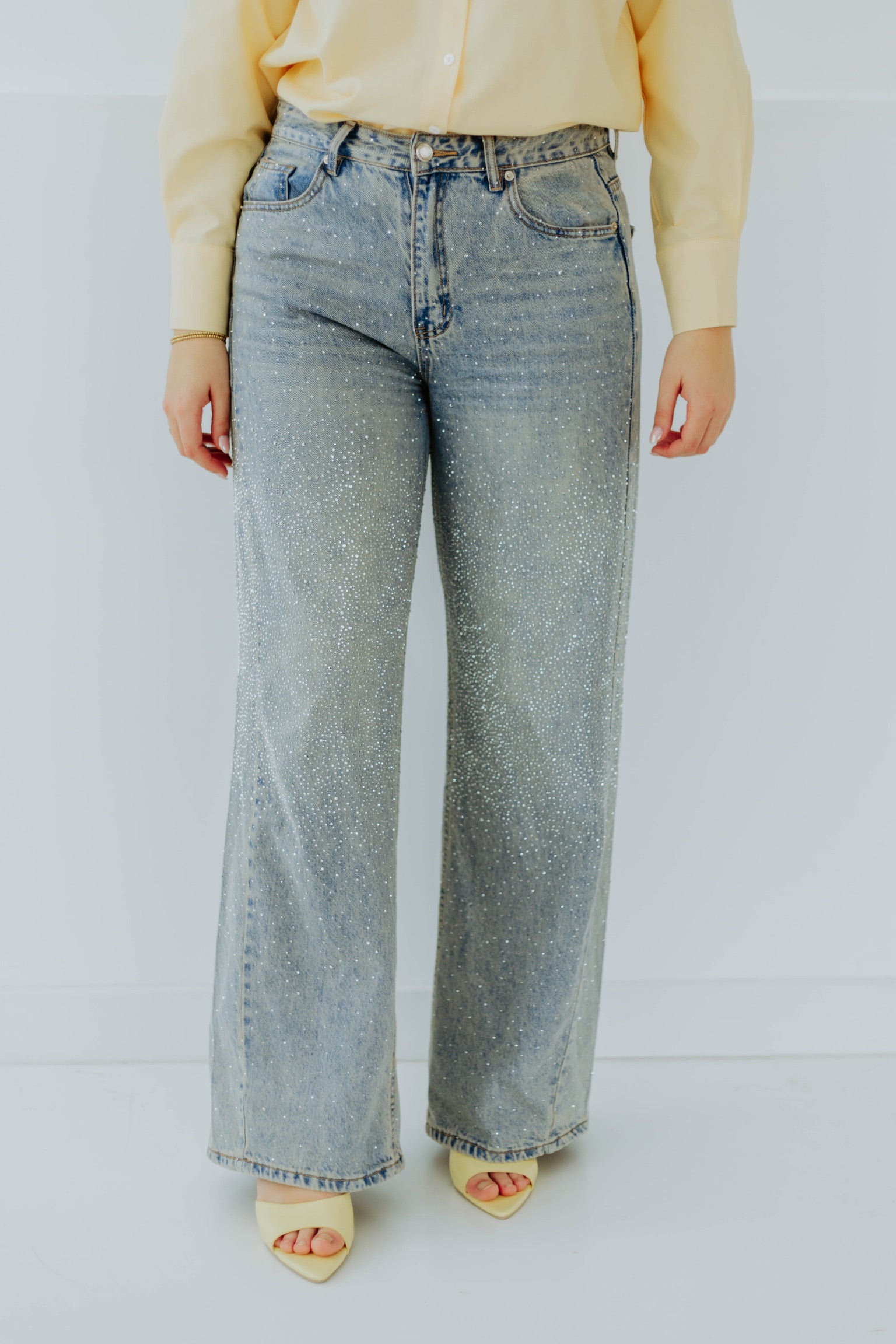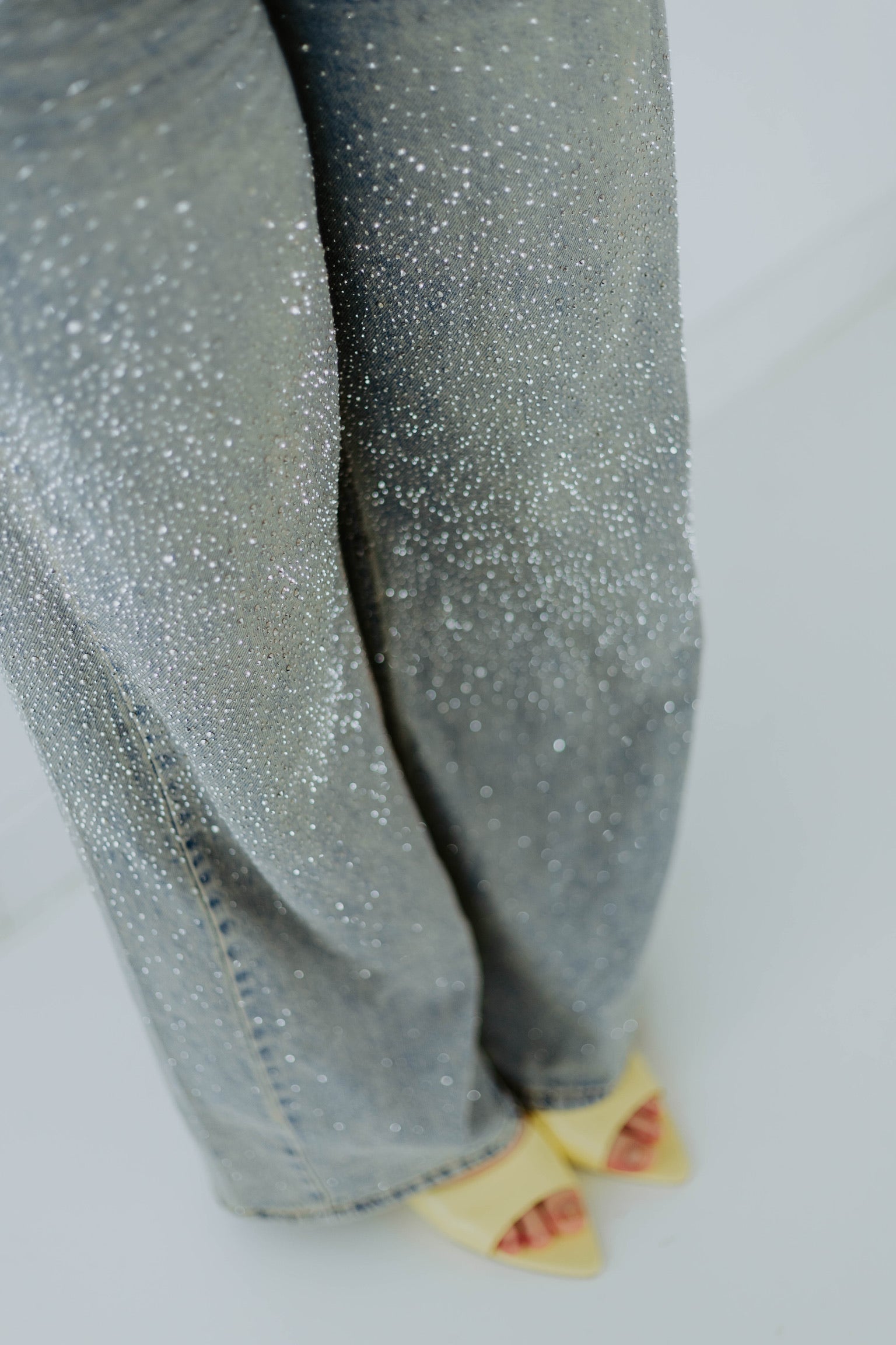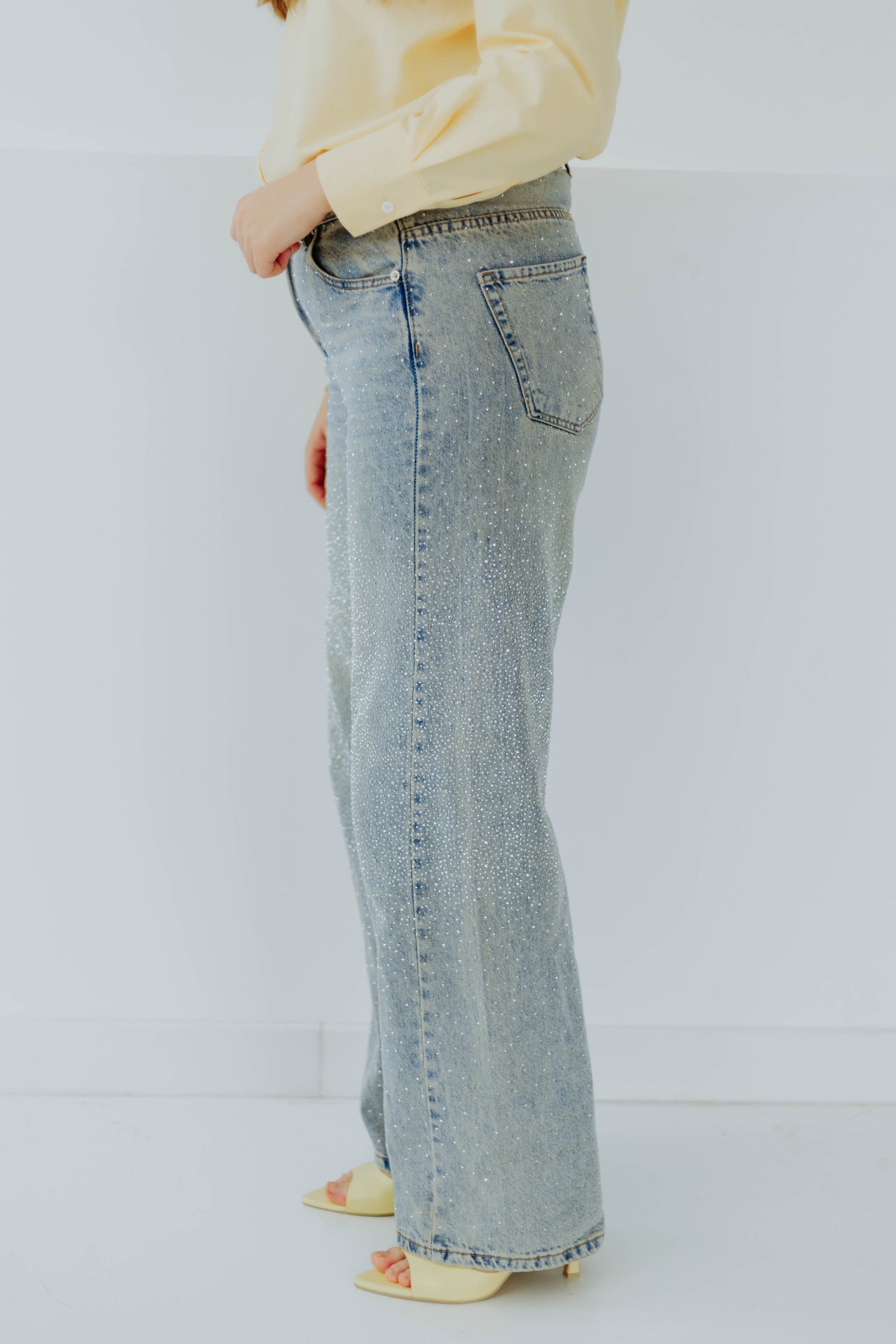 LIGHT BLUE RHINESTONE WIDE LEG JEANS A3022