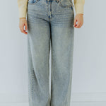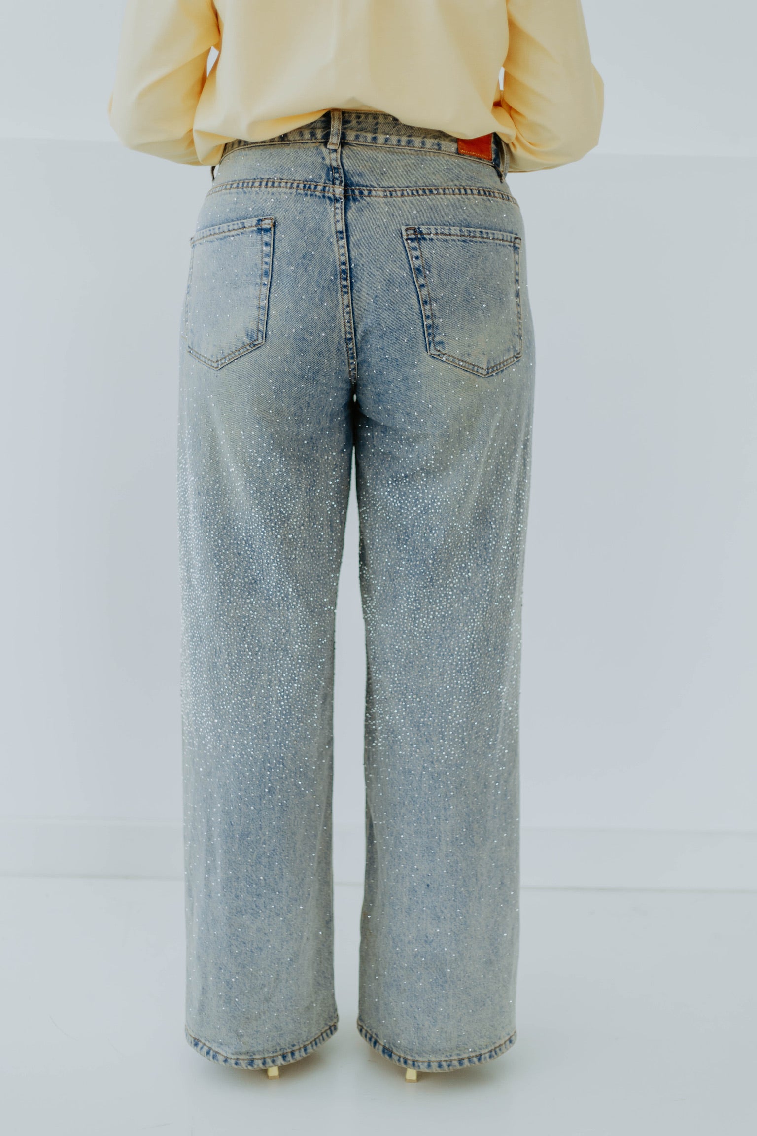 Een losse, wide leg jeans in een frisse lichtblauwe tint die een speelse en feestelijke touch krijgt door subtiele steentjes. Het comfortabele model beweegt mee en geeft een ontspannen maar stijlvolle uitstraling. Perfect om tijdens de feestdagen casual chic en sprankelend voor de dag te komen.