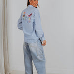 Een frisse blauw-witte streep krijgt een romantische twist door het subtiele rozenhart op de borst. De leuke liefdevolle boodschap op de rug maakt deze look helemaal af.