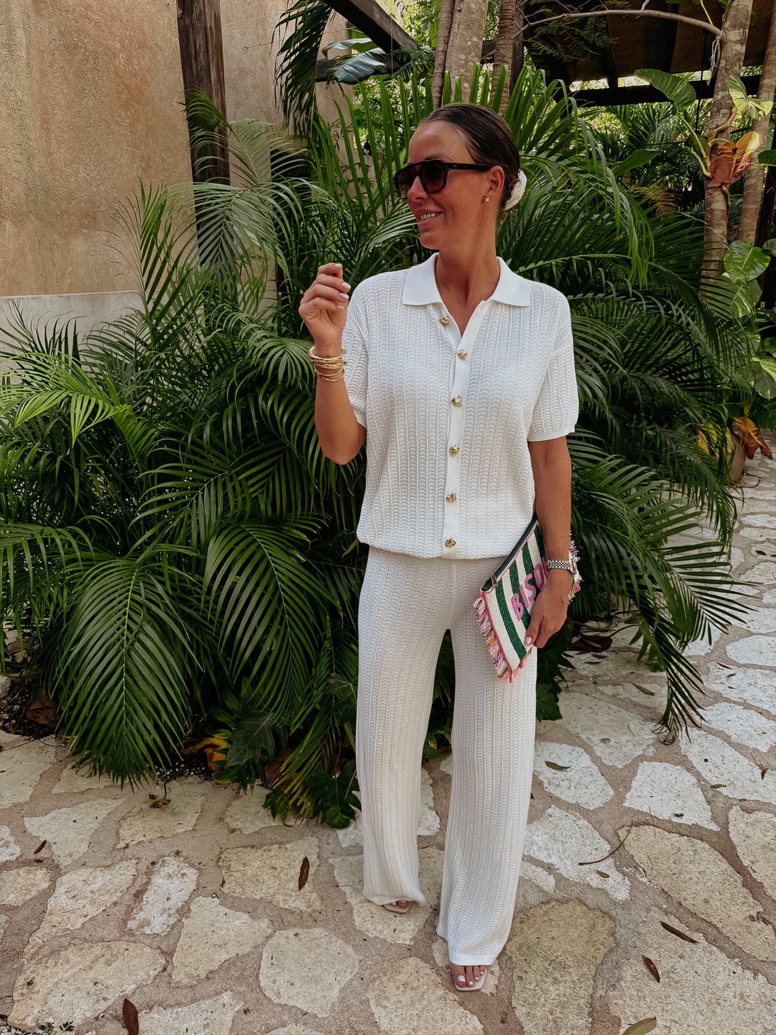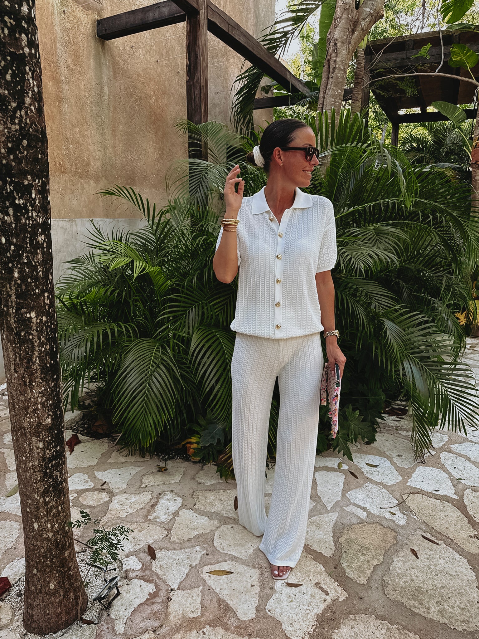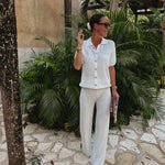 Luchtige ecru broek met fijn haakwerk die direct een relaxte, zomerse vibe geeft. Het zachte ontwerp beweegt makkelijk mee en voelt heerlijk koel aan tijdens warme dagen. Perfect te combineren met de bijpassende blouse of solo voor een moeiteloze strand- of vakantie-outfit.