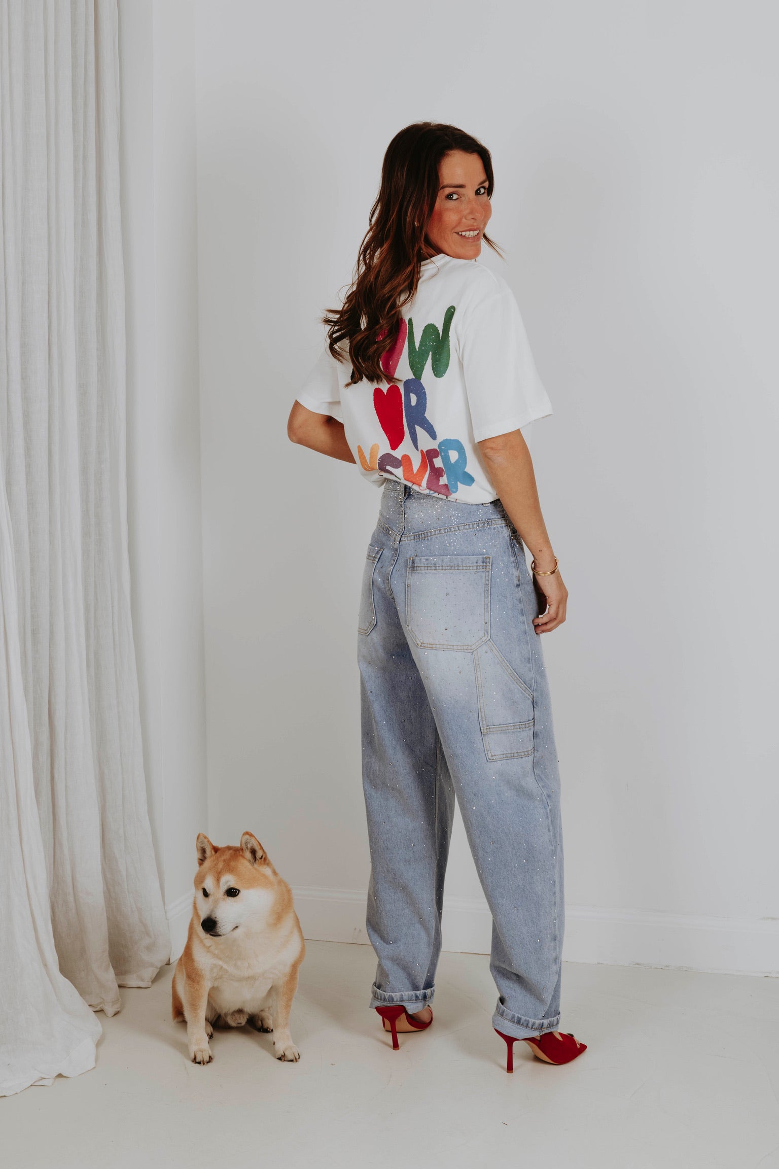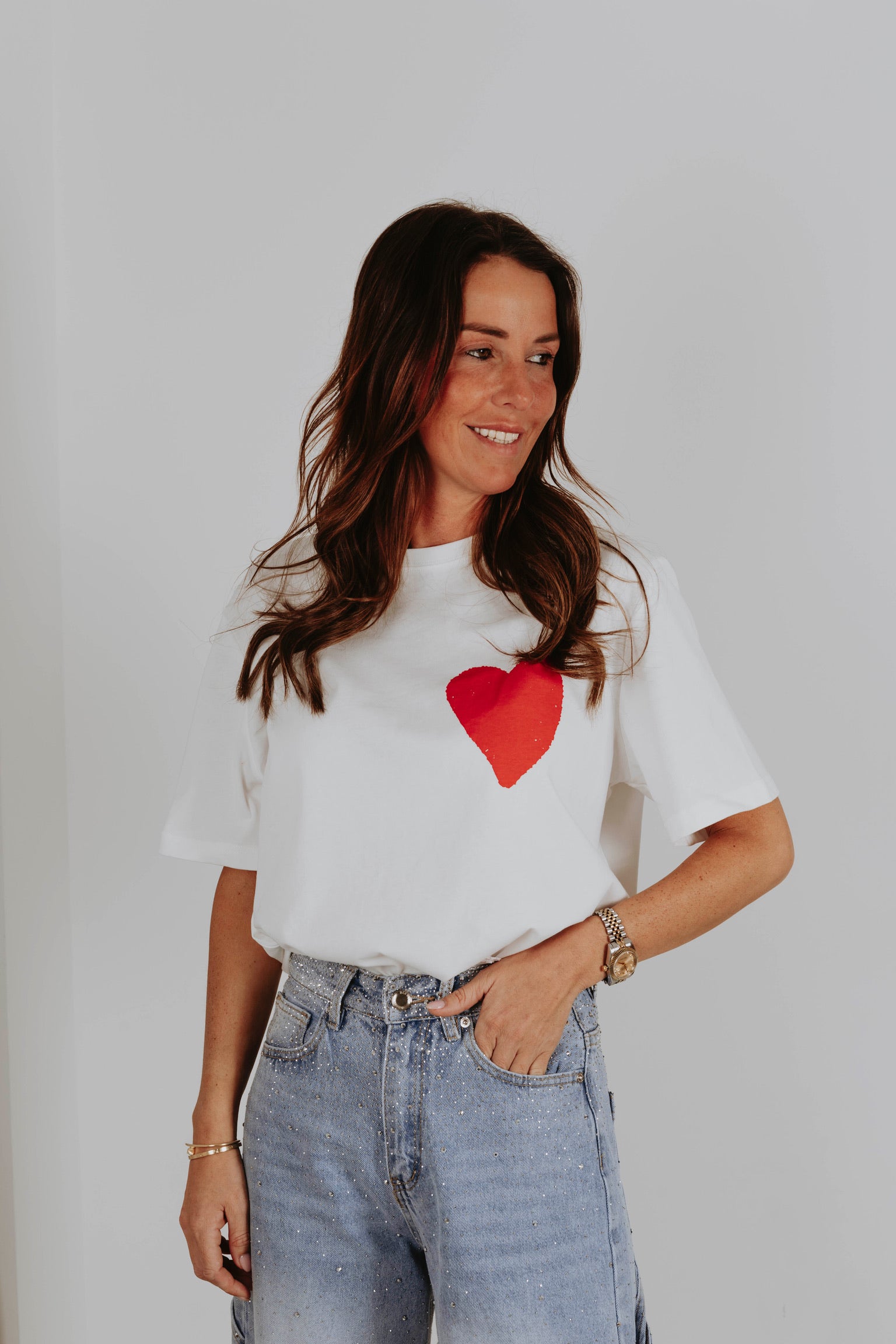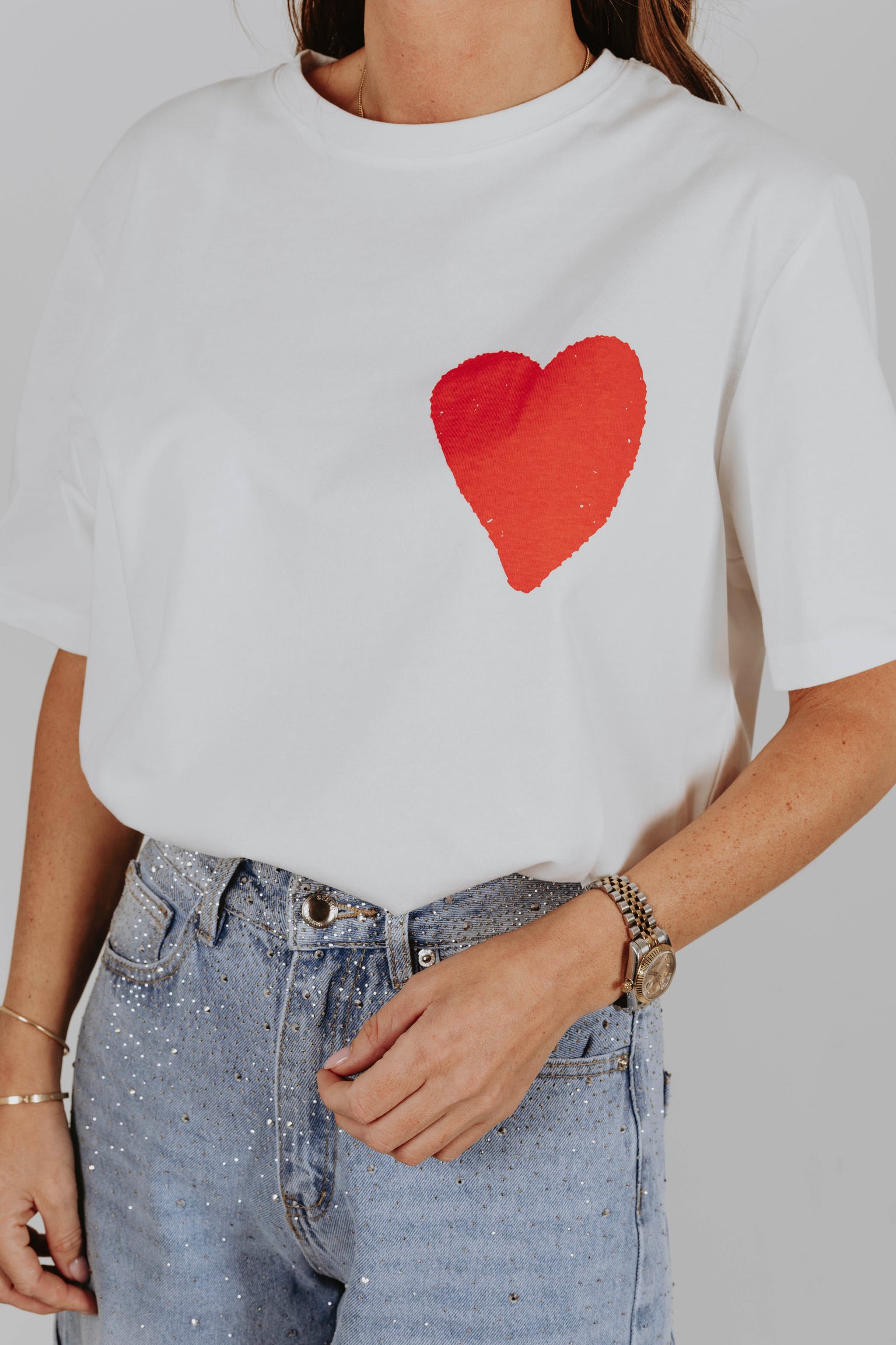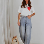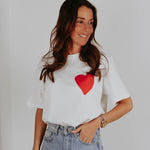 Een clean witte basis met een rood hart op de borst krijgt aan de achterkant een krachtige boodschap in speelse, kleurrijke letters. Het contrast tussen rustig en expressief maakt dit item perfect voor wie liefde durft te laten zien. Een statement dat draait om het moment, precies zoals Valentijn bedoeld is.
