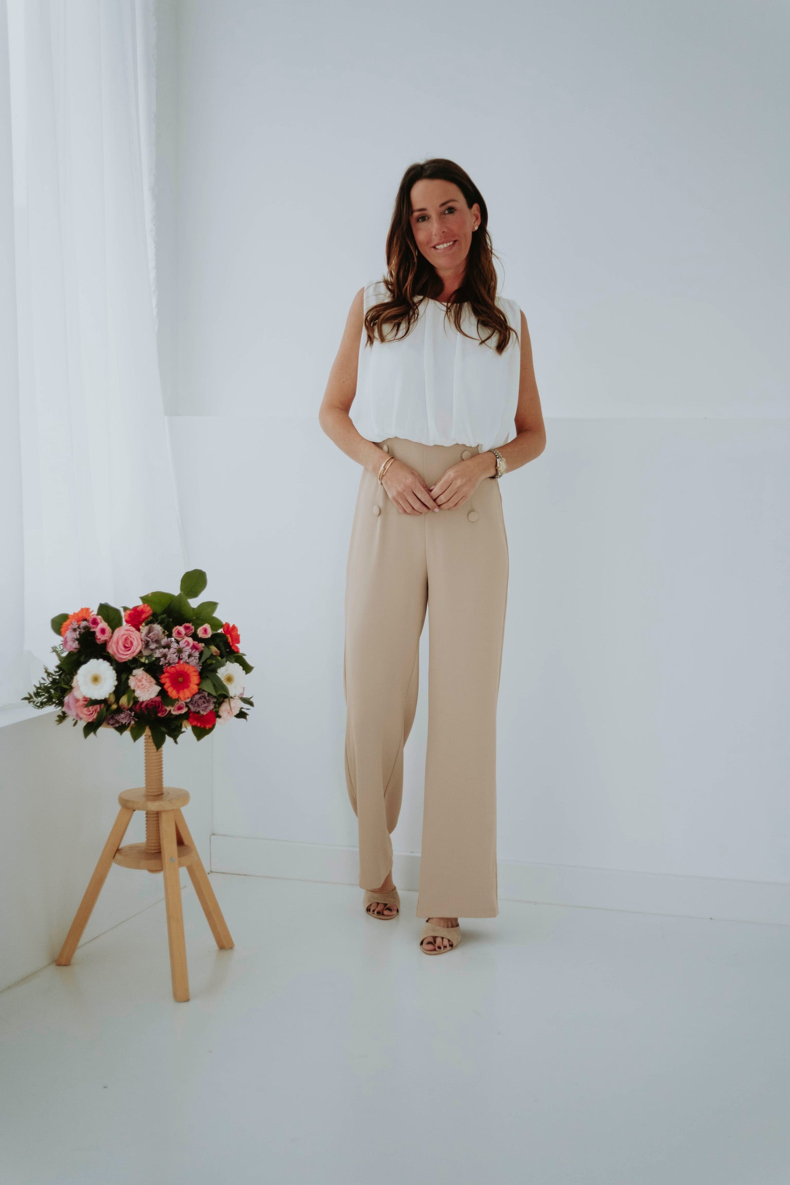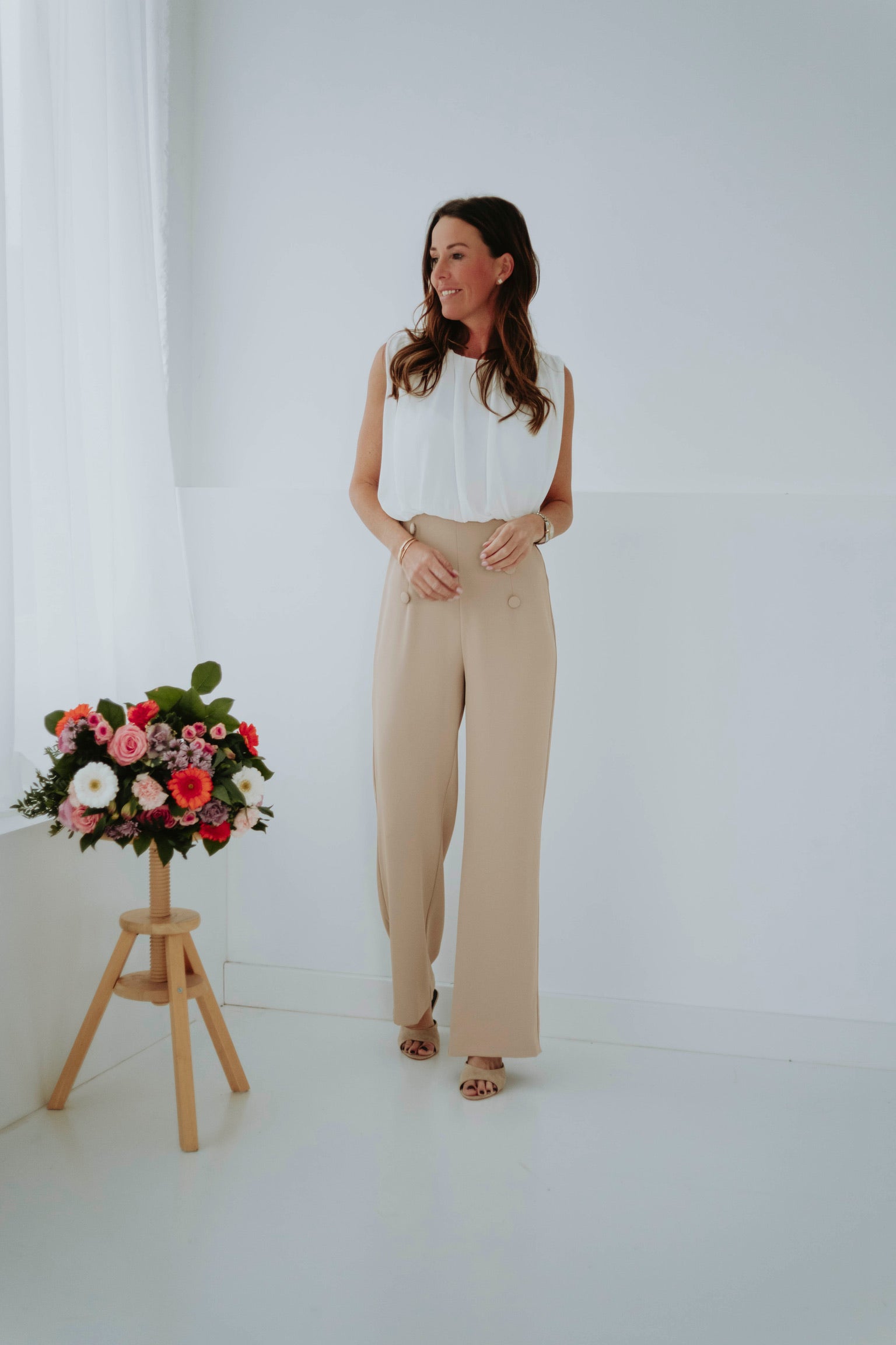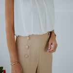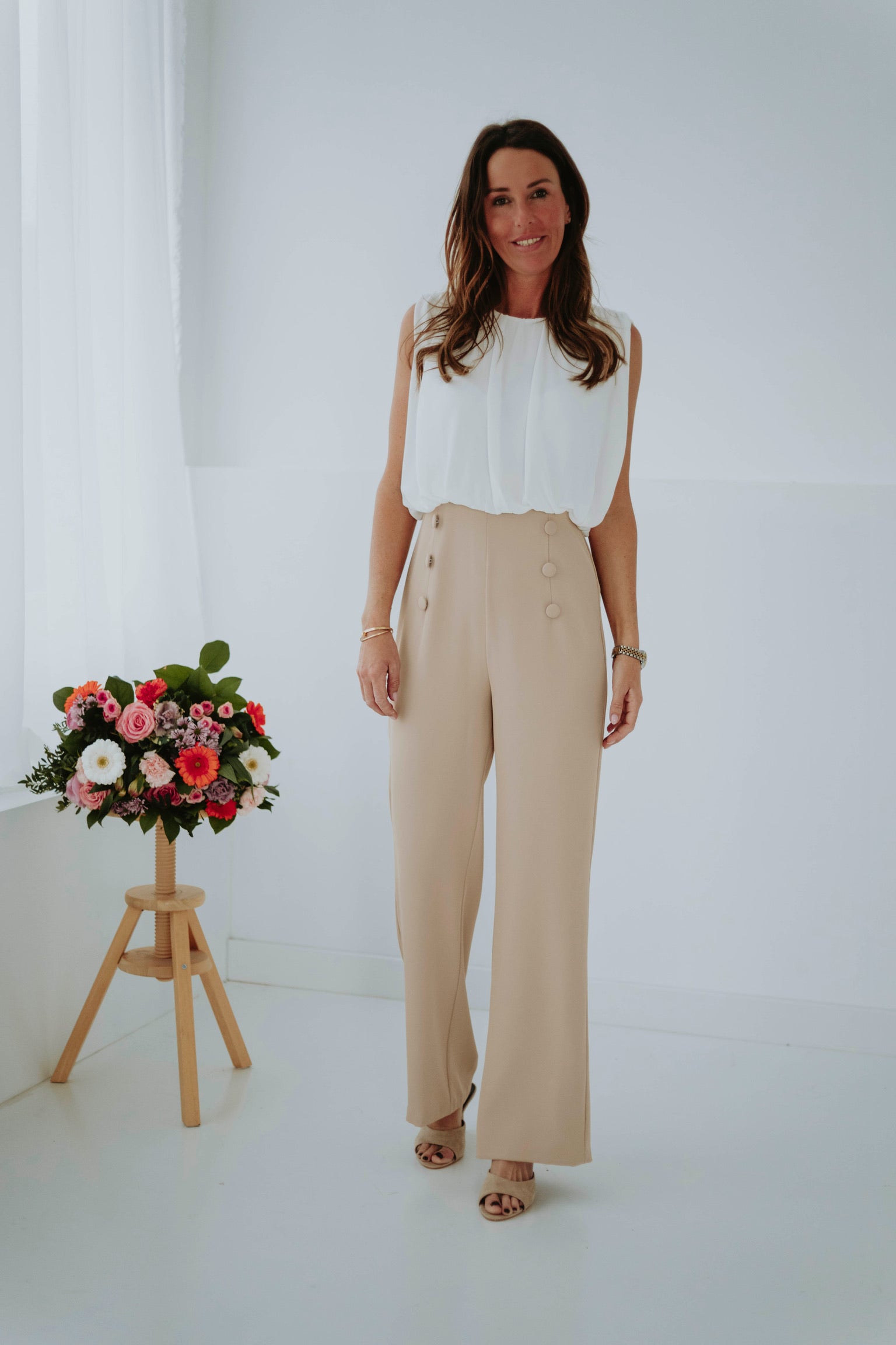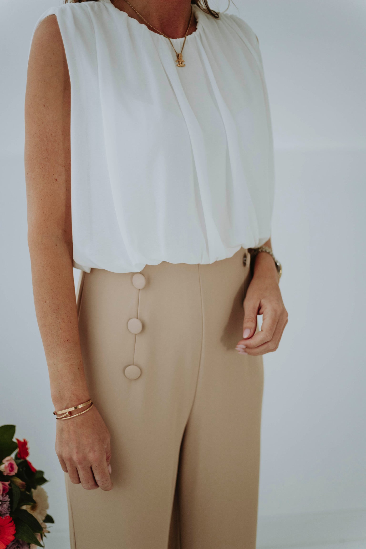 Elegant en moeiteloos stijlvol, zonder mouwen voor een lichte, luchtige uitstraling, afgewerkt met knopen in dezelfde tint die iedere beweging zachtjes benadrukken en een verfijnde lentetwist geven.