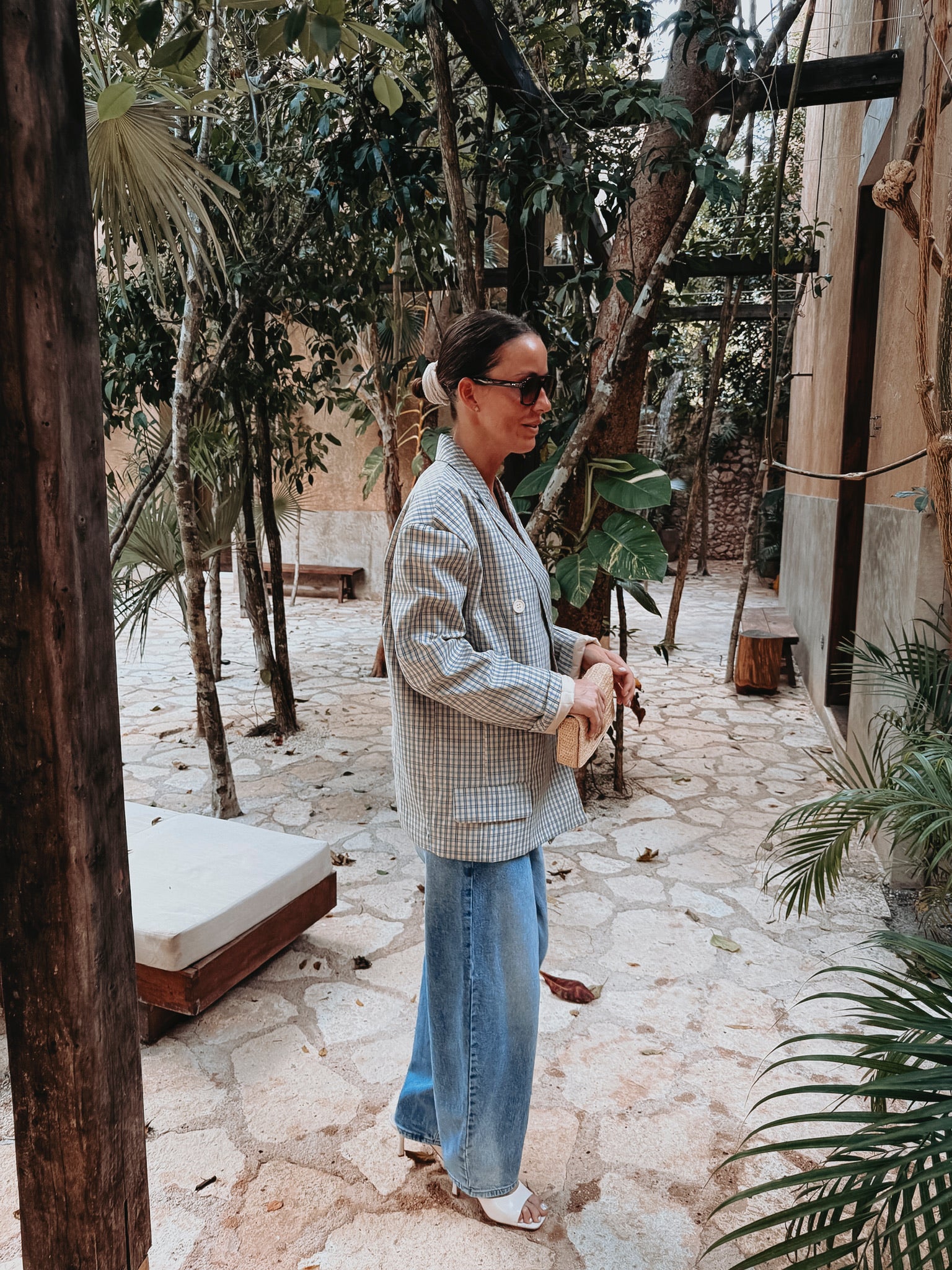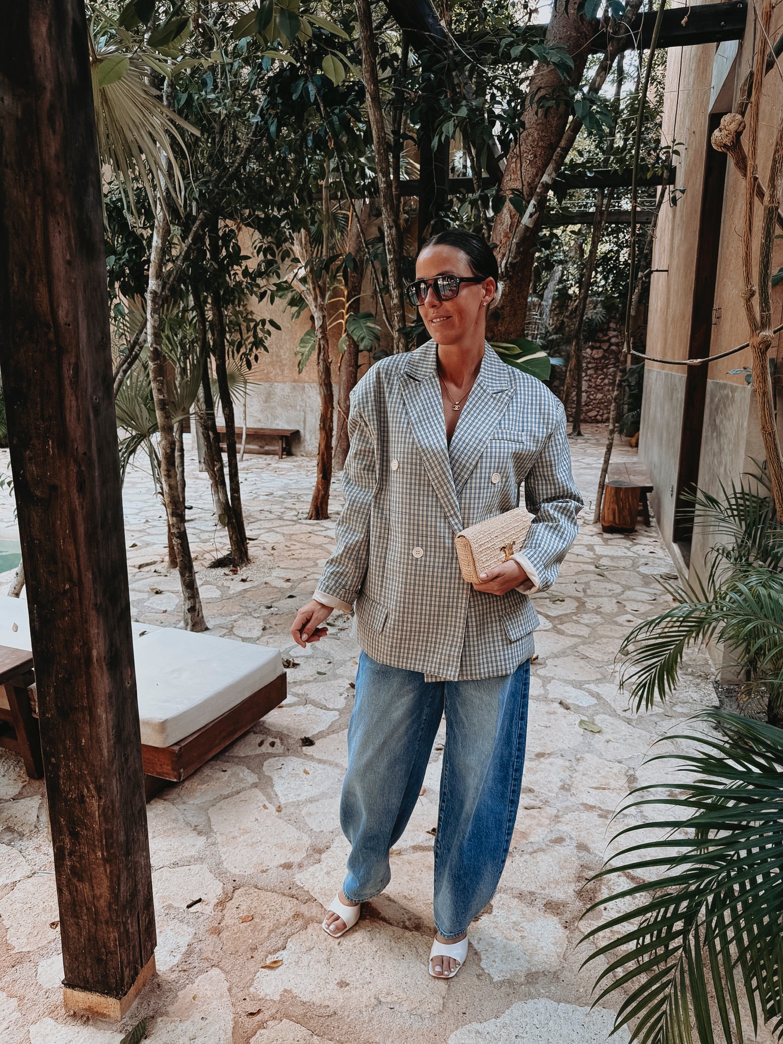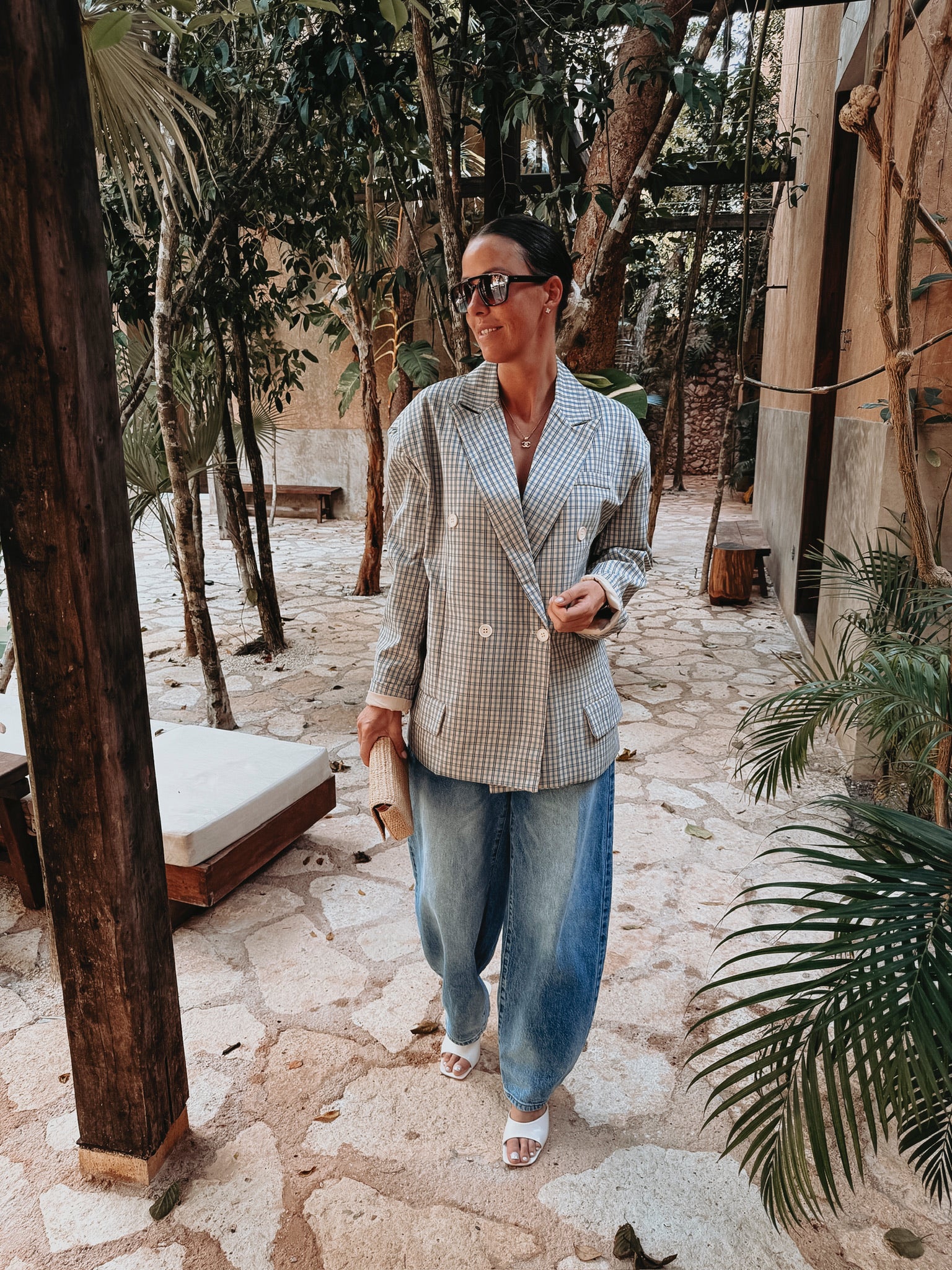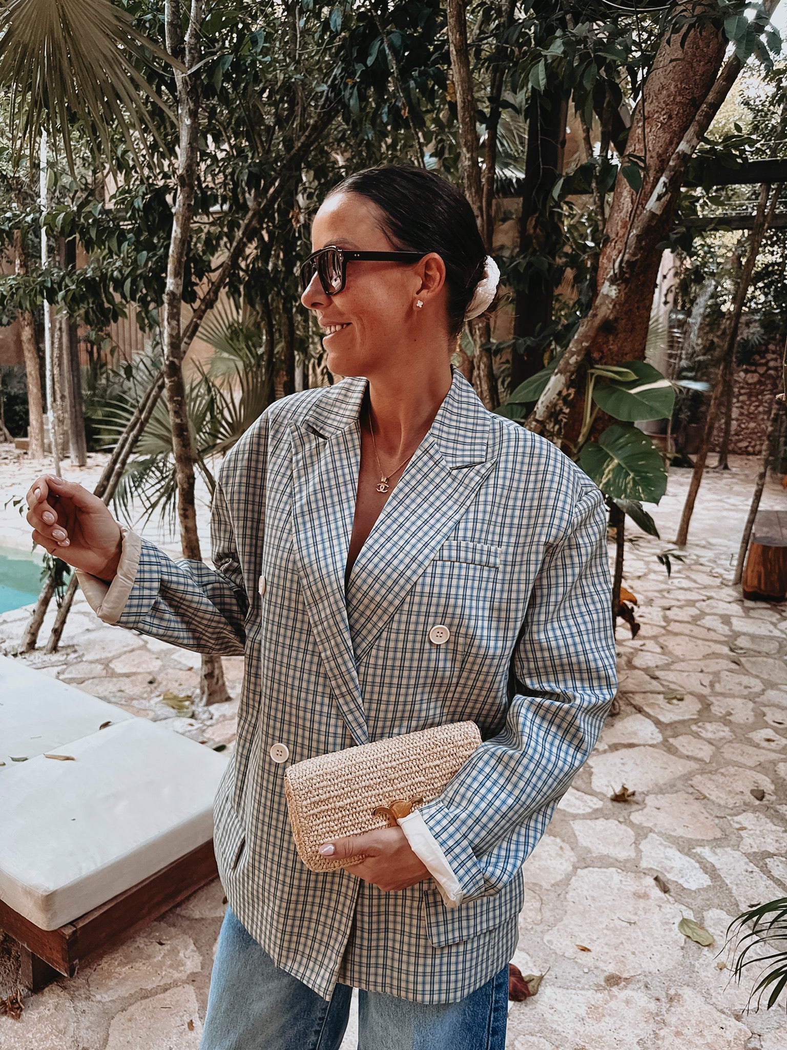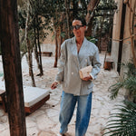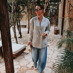 Een frisse beige blazer met een subtiel ruitpatroon dat meteen een stijlvolle, zomerse uitstraling geeft. Licht en luchtig, perfect om een outfit een verfijnde touch te geven zonder dat het te zwaar aanvoelt.