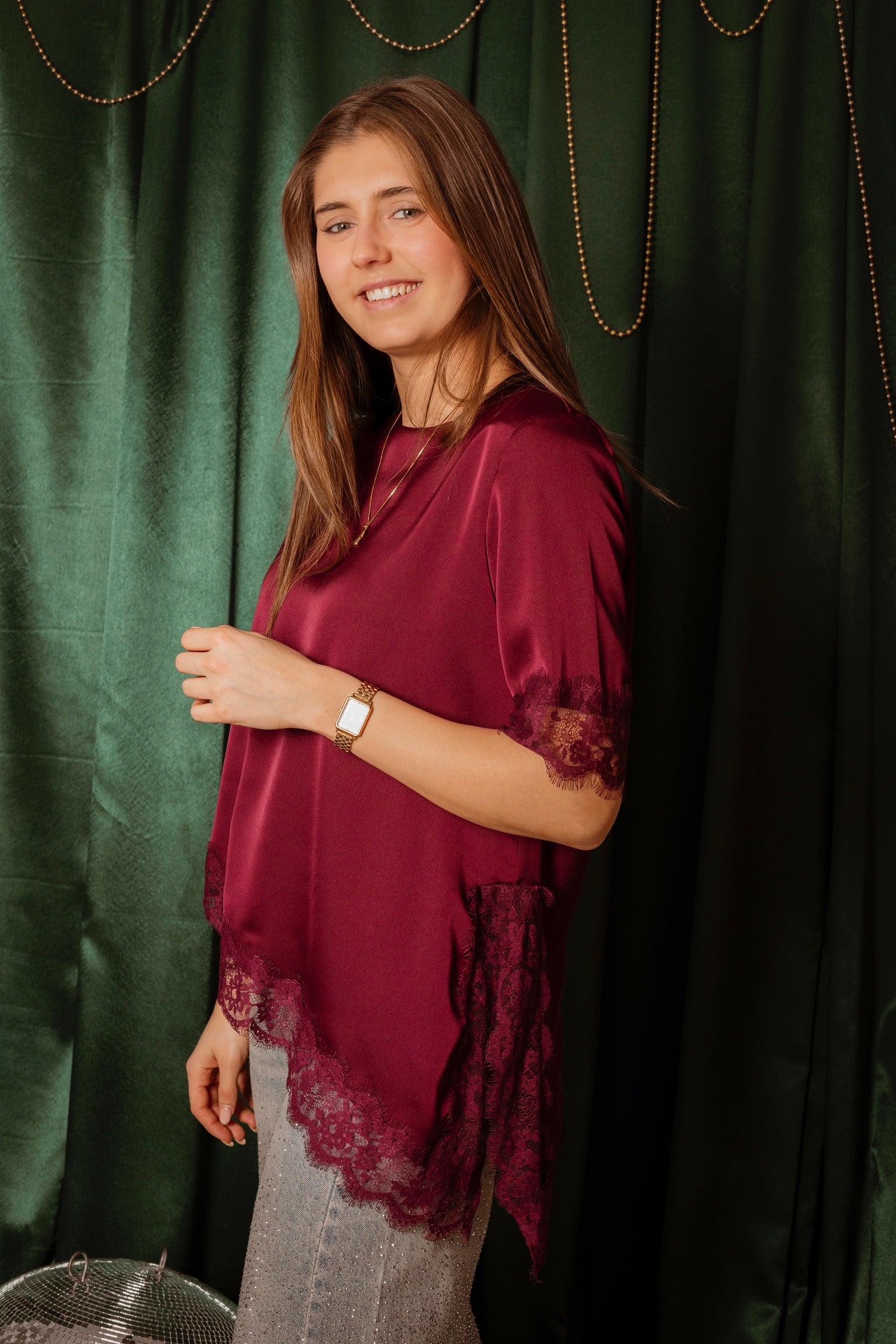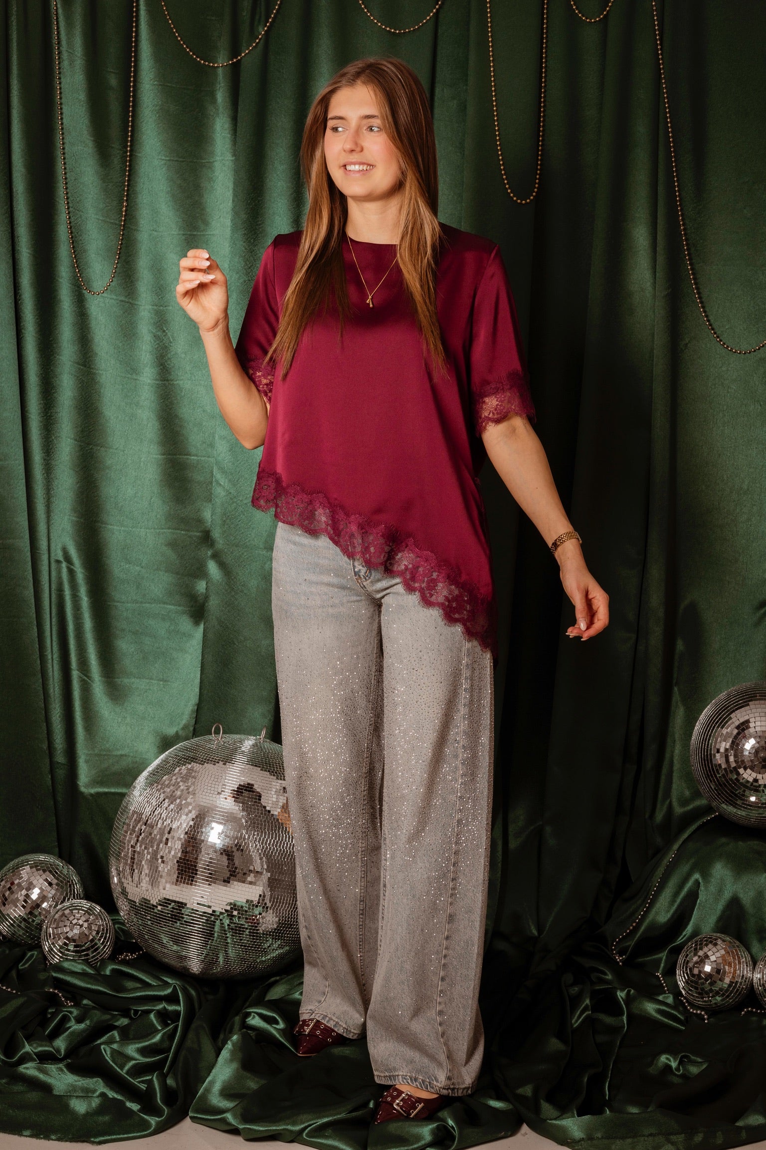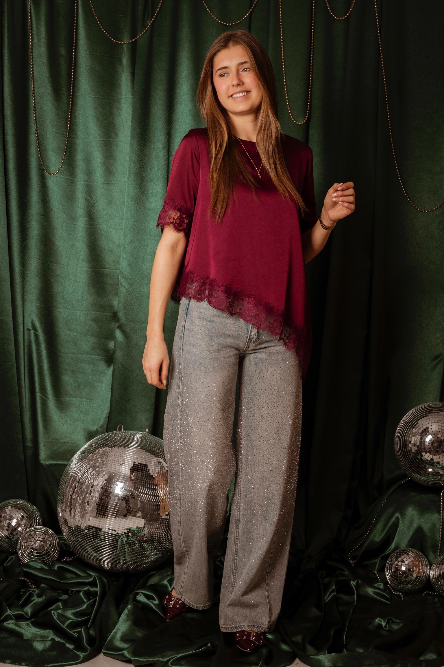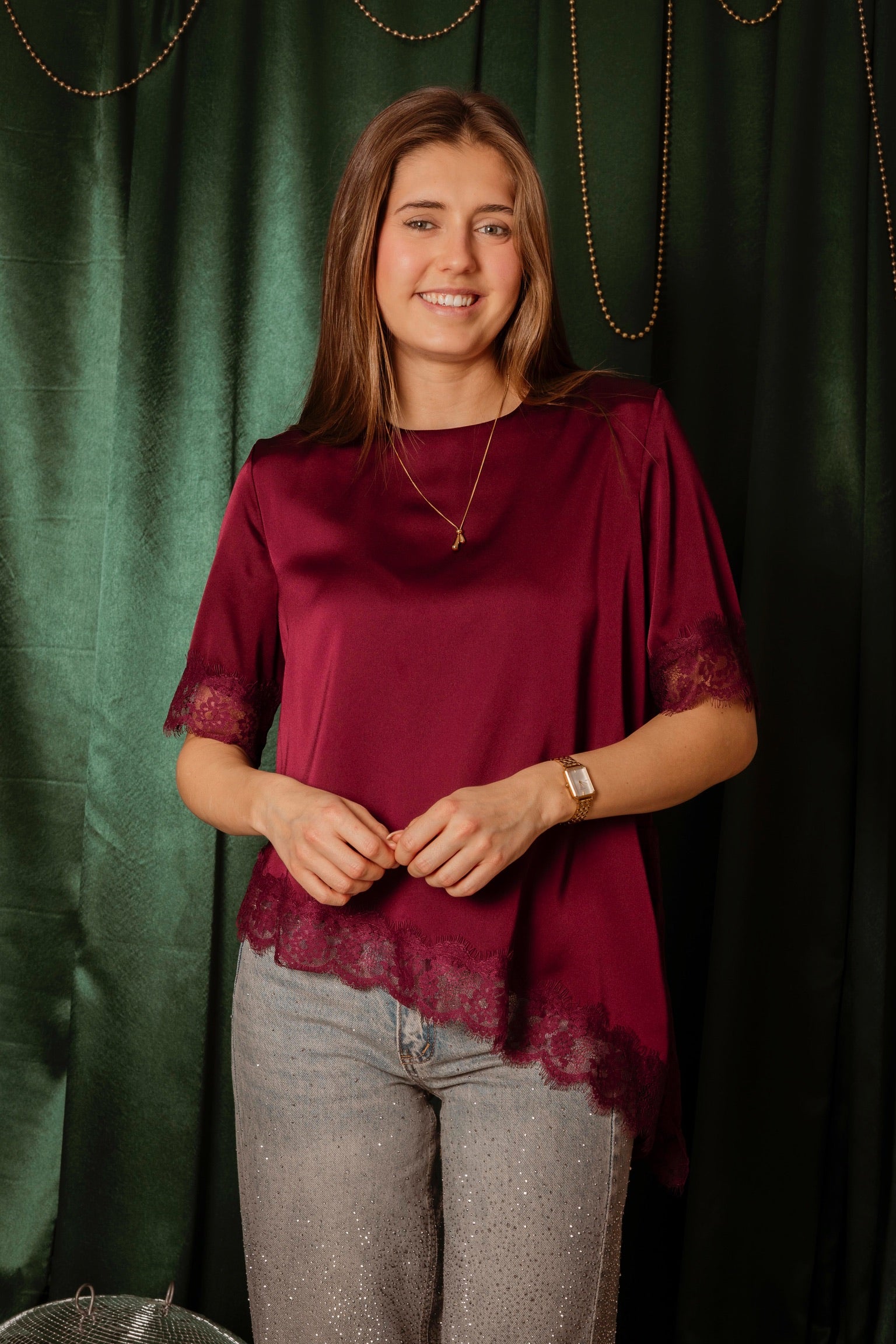 Een speels en feestelijk ontwerp dat direct de kerstsfeer oproept. Het satijnen materiaal glanst subtiel terwijl de kantdetails een elegante touch toevoegen. Stijl het eenvoudig op een jeans voor een moeiteloos chic en sprankelend winterlookje.