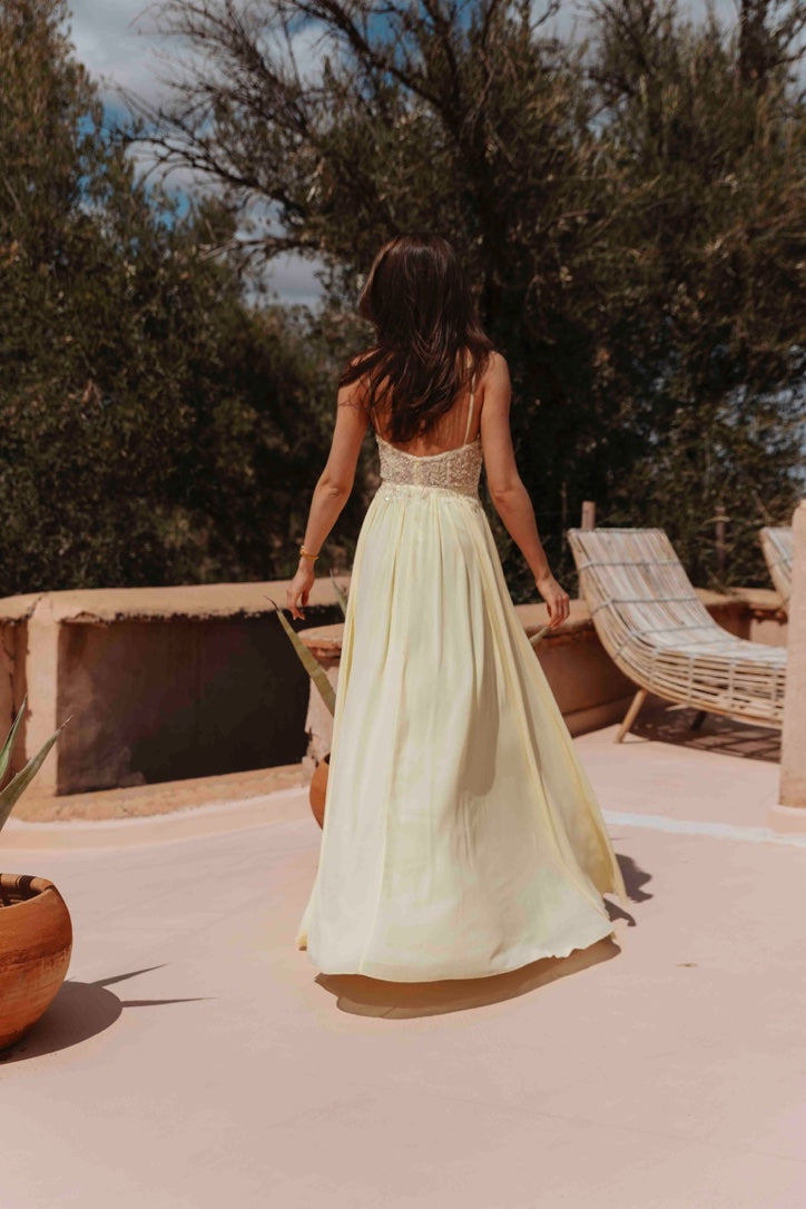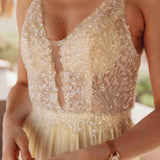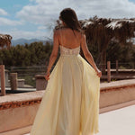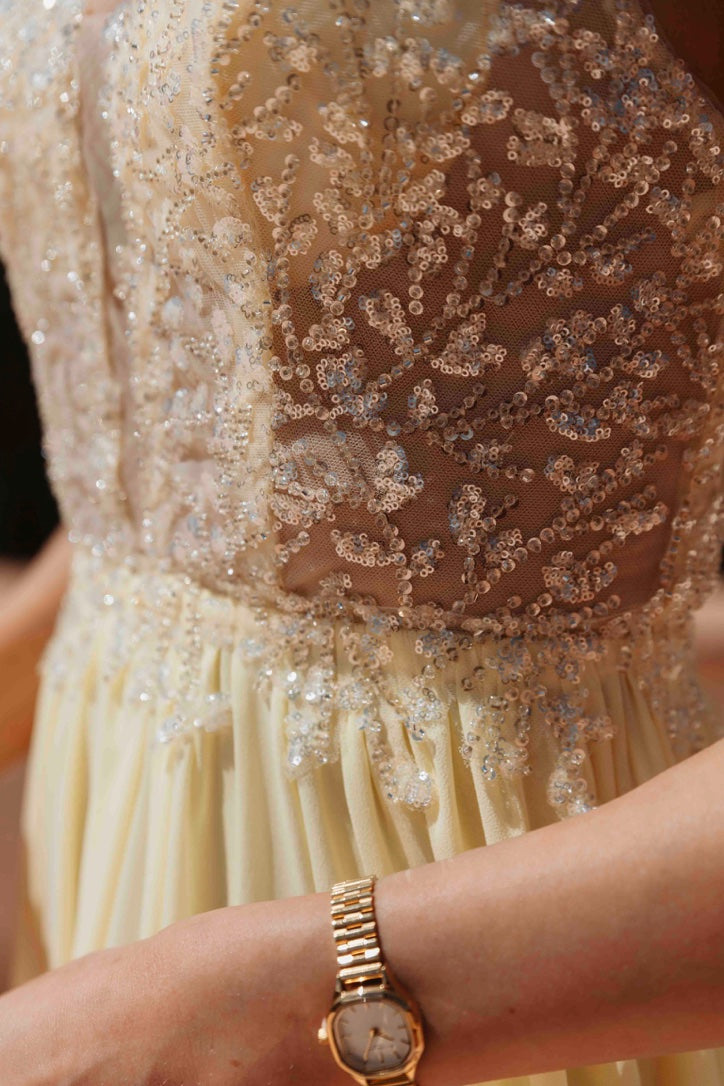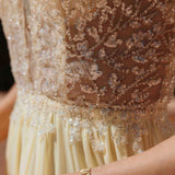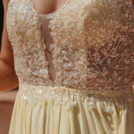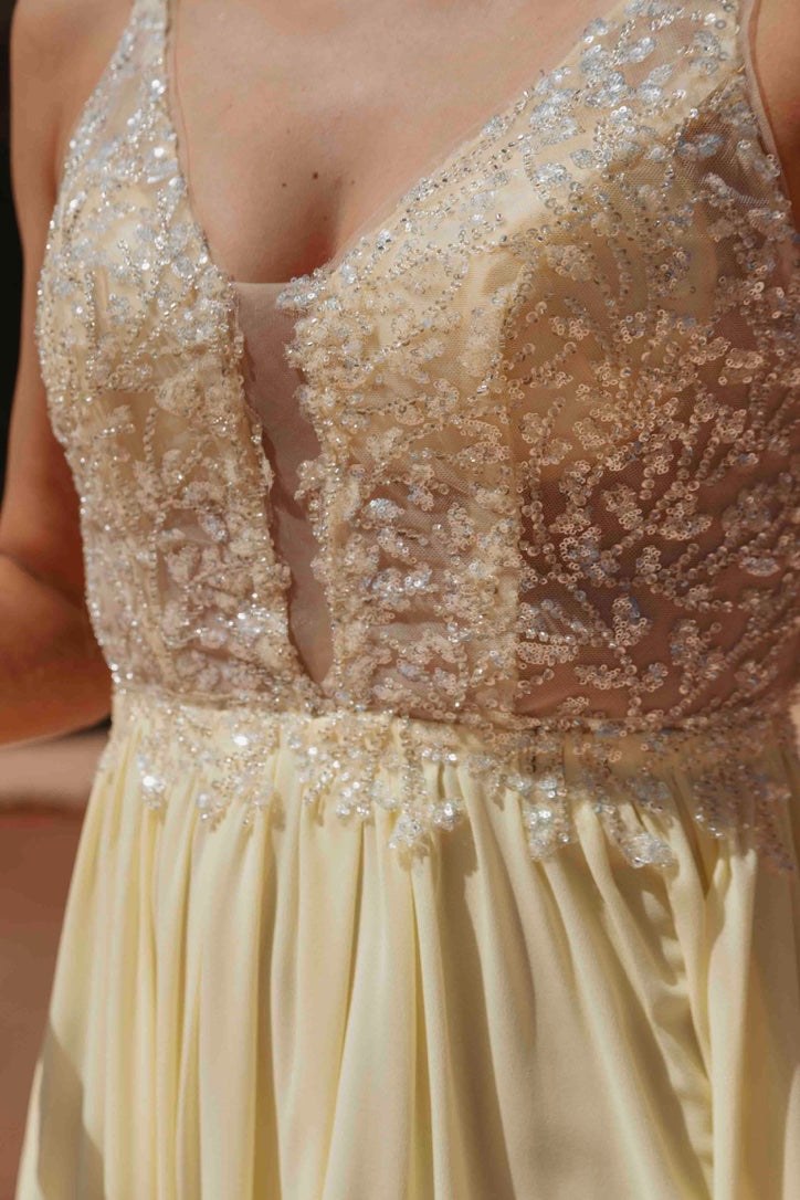 Deze betoverende bruidsfeestjurk is een ware blikvanger, met een prachtige kleur die de elegantie van de gelegenheid benadrukt. De buste is volledig bedekt met glinsterende details, die de jurk een magische en sprankelende uitstraling geven.
