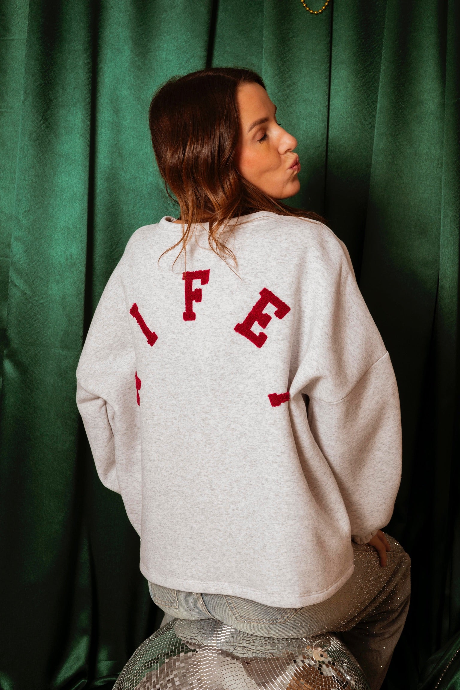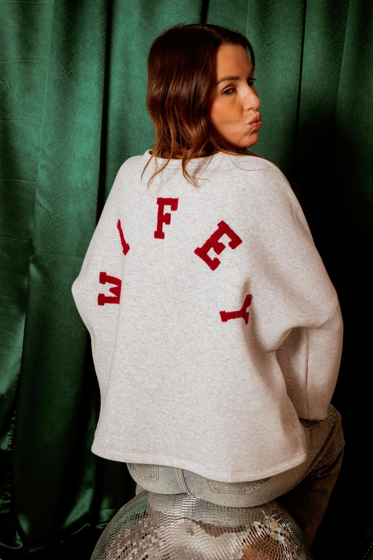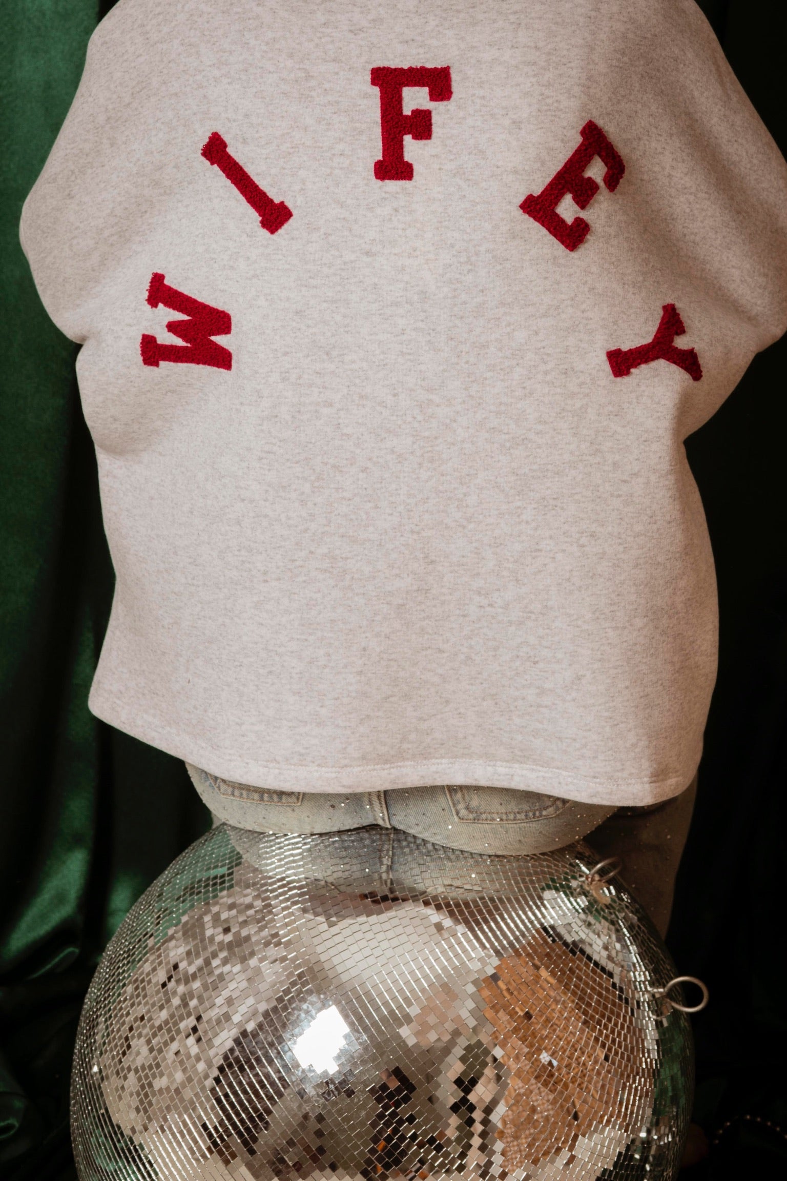 Een cozy sweater met grote, opvallende bordeau letters die WIFEY achteraan dragen. Perfect cadeautje voor onder de kerstboom !