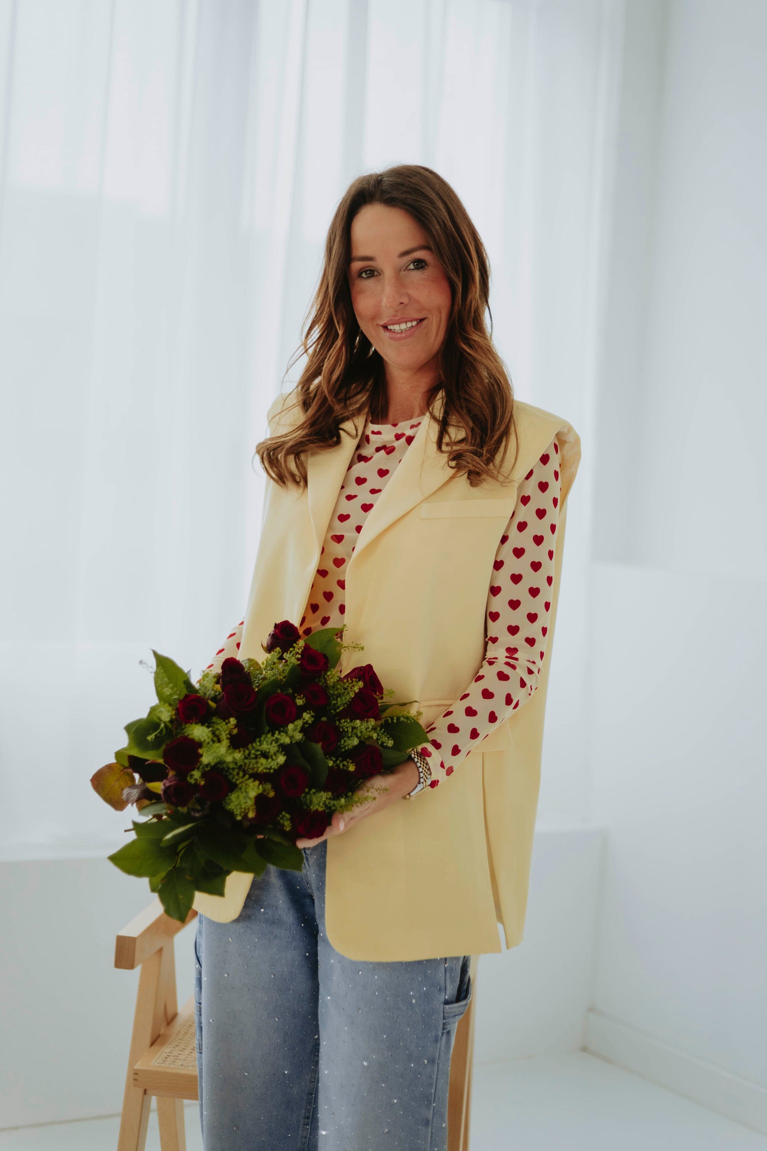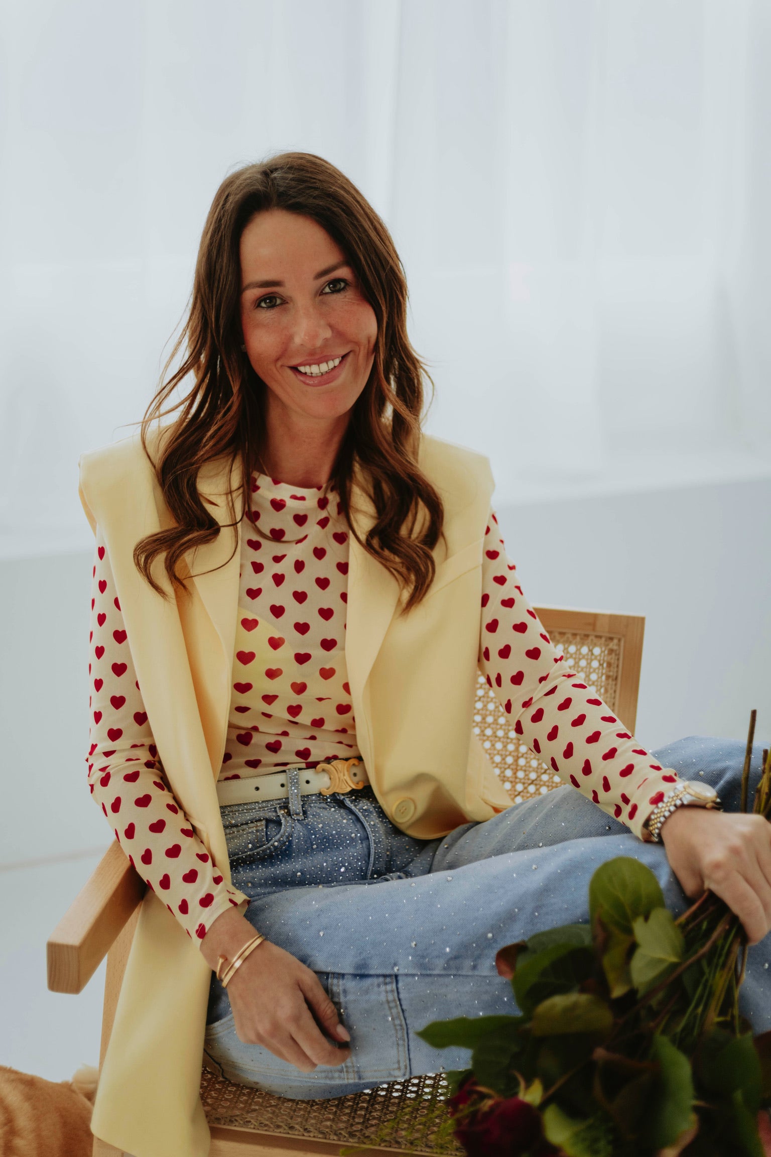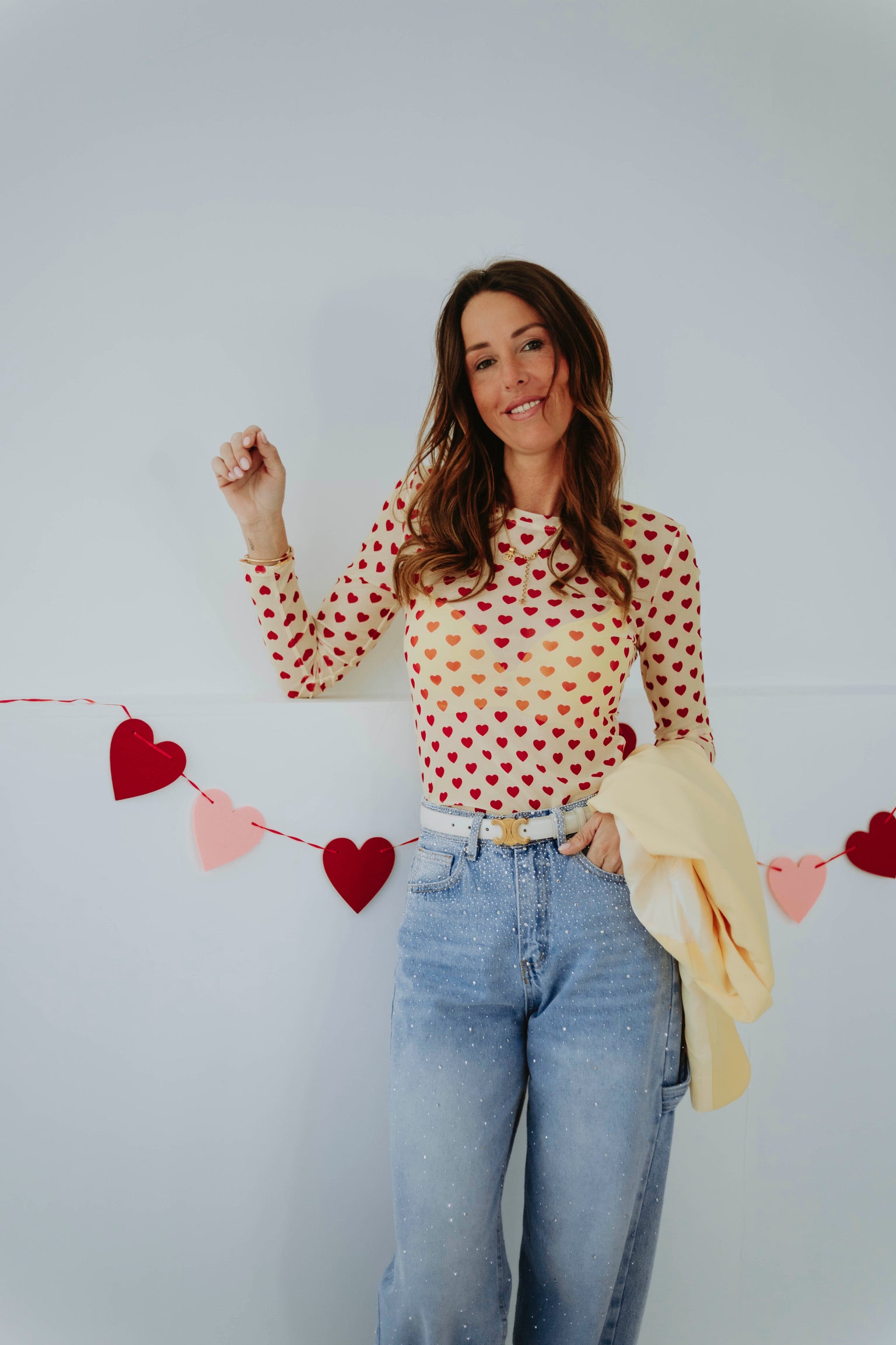 De zachte lichtgele tint in combinatie met kleine rode hartjes zorgt voor een speelse en romantische uitstraling. Het lichte materiaal maakt het ideaal om onder een mouwloze blazer te dragen. Perfect voor een valentijns datenight met een frisse en charmante vibe.