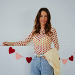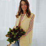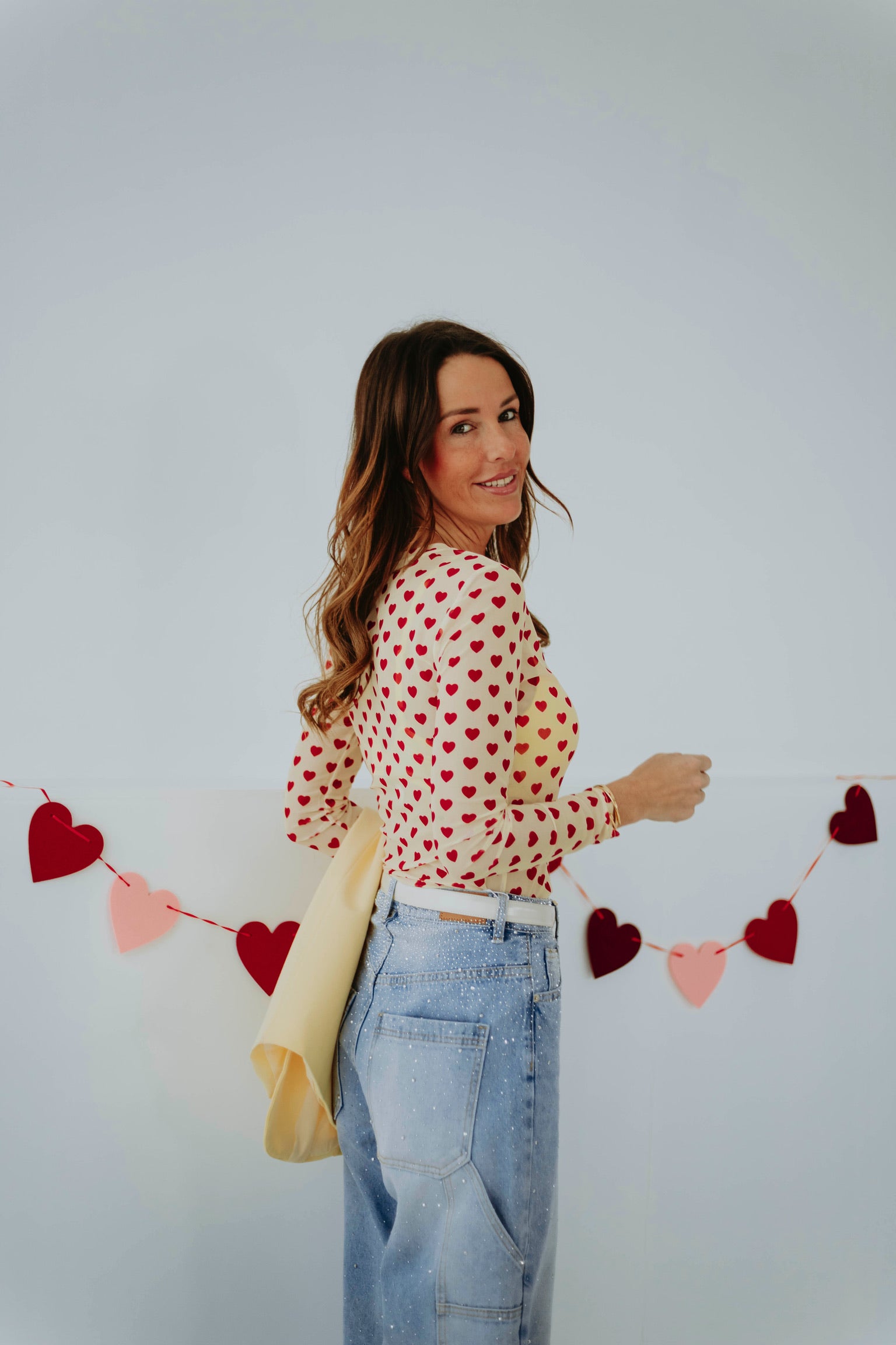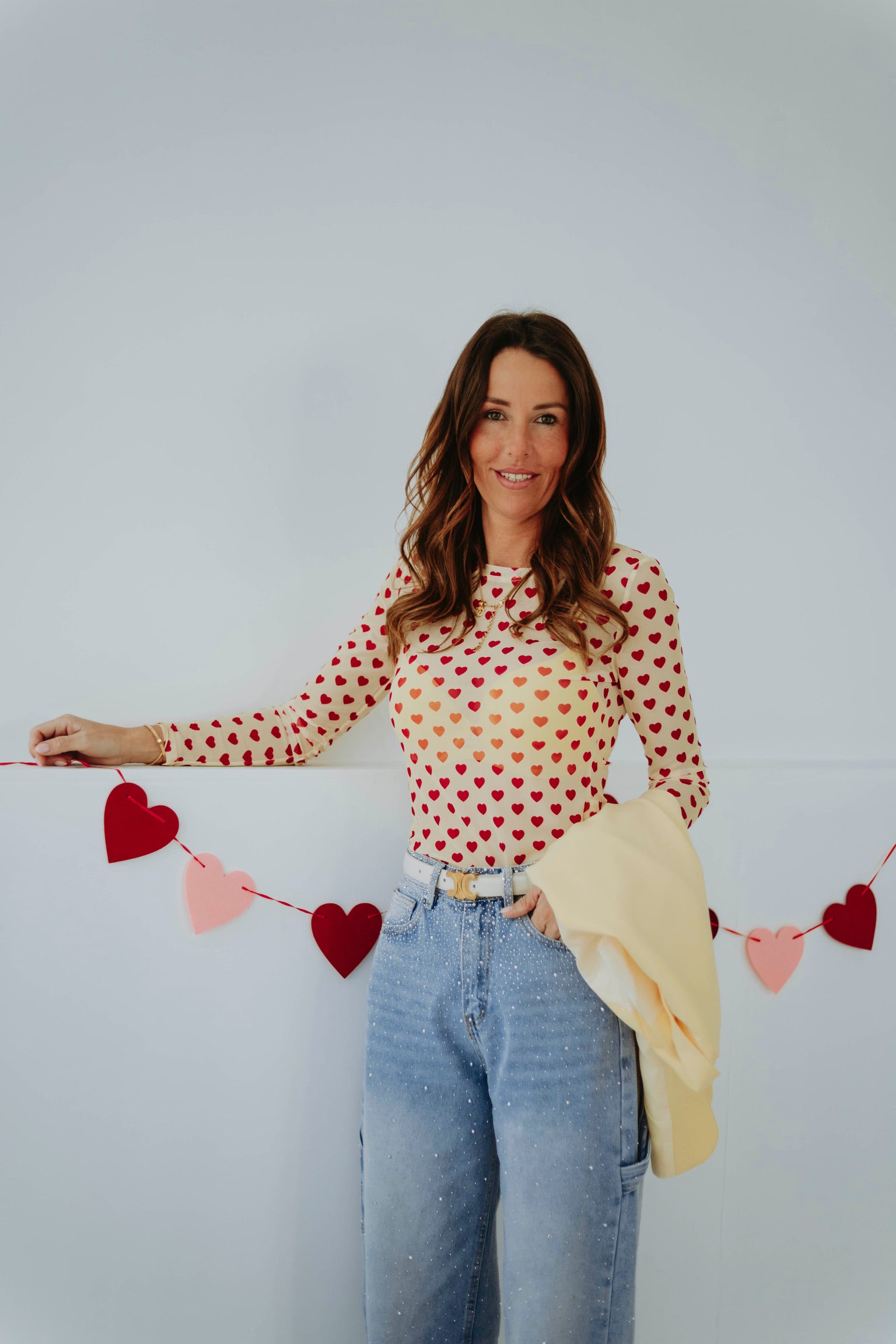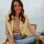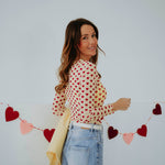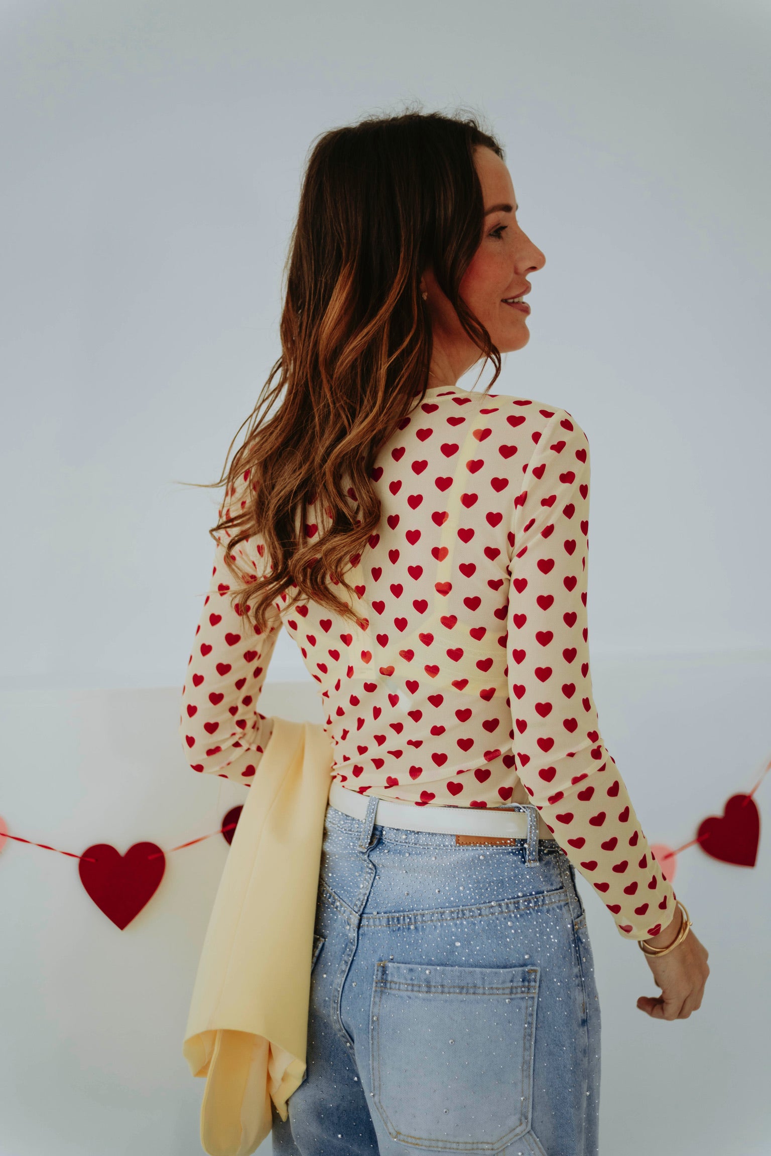 De zachte lichtgele tint in combinatie met kleine rode hartjes zorgt voor een speelse en romantische uitstraling. Het lichte materiaal maakt het ideaal om onder een mouwloze blazer te dragen. Perfect voor een valentijns datenight met een frisse en charmante vibe.