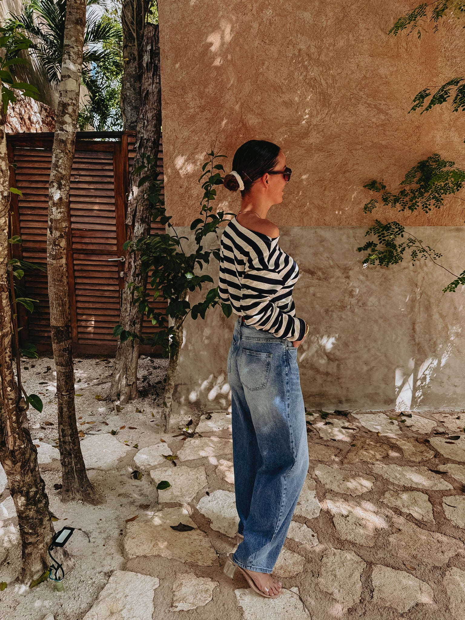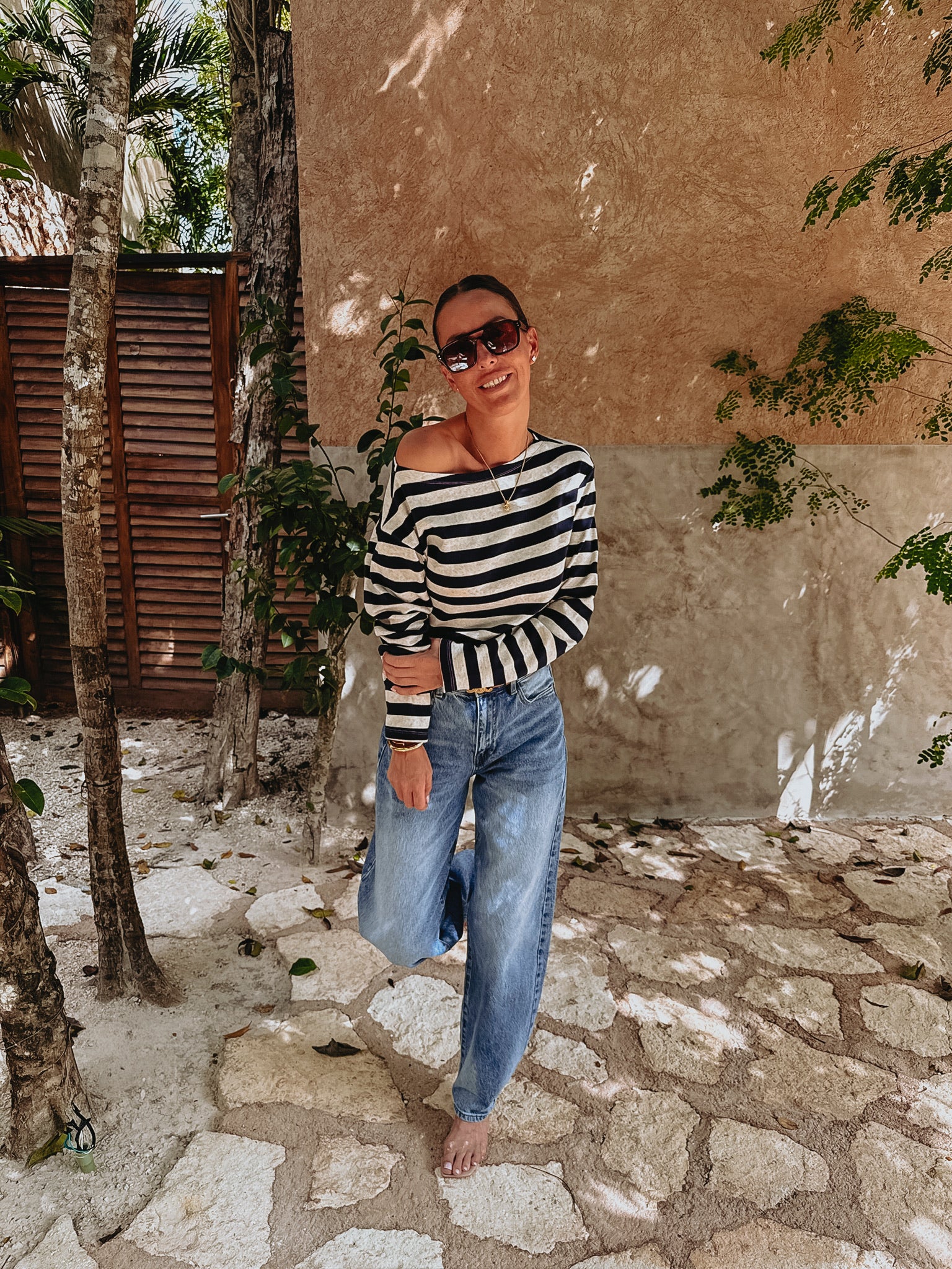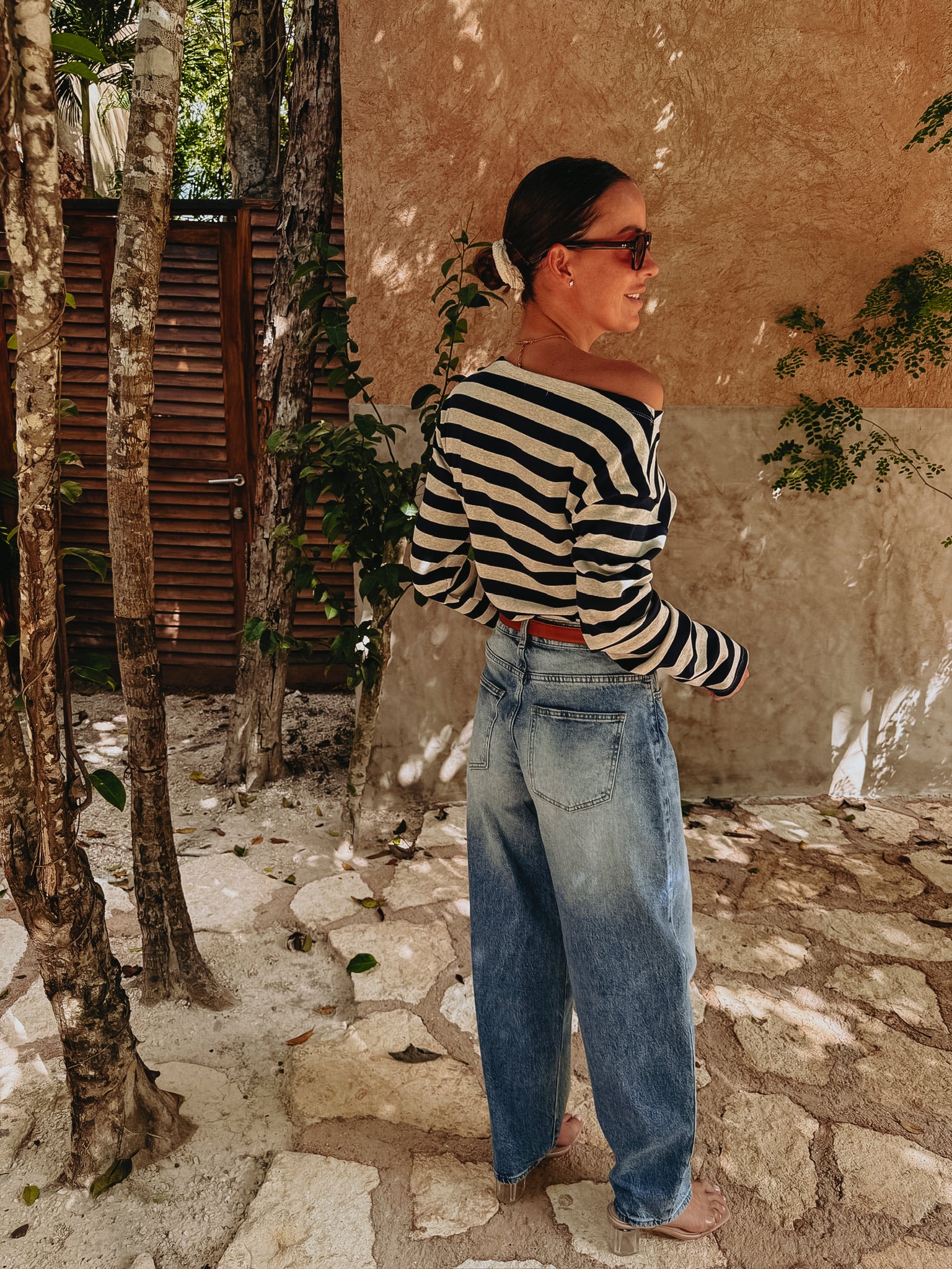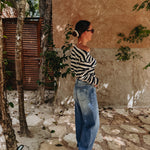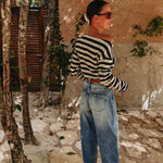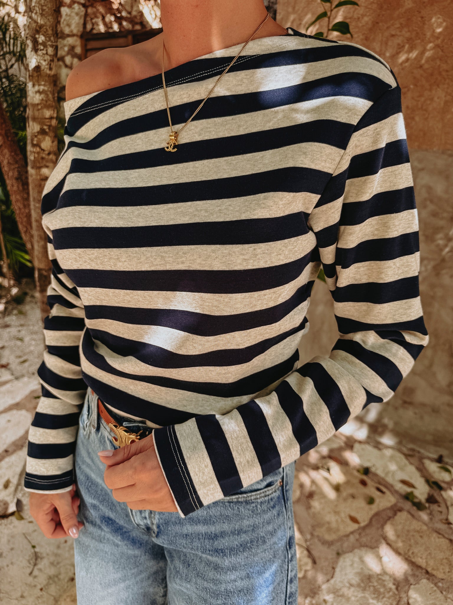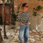 Longsleeve in donkerblauw en ecru met strepen, die je speels van de schouder kunt dragen aan één kant. Perfect voor zomerse dagen met een nonchalante, stijlvolle touch.